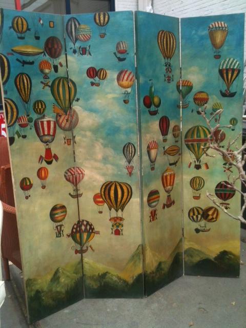 Hand painted folding screen with oldfashioned balloons! Very rare, in very nice condition. Dimensions: 1.80m high, 1.60m wide. Weighs about 20 kgs.
