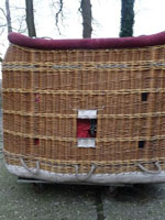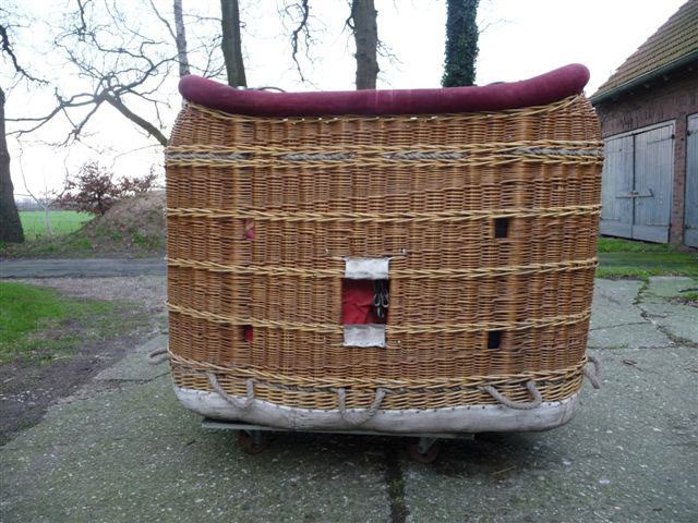 Cameron 105 basket, built 1995, 1.25m x 1.55m. With red suede top rim and pole covers, poles, karabiners, tank straps.