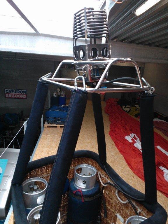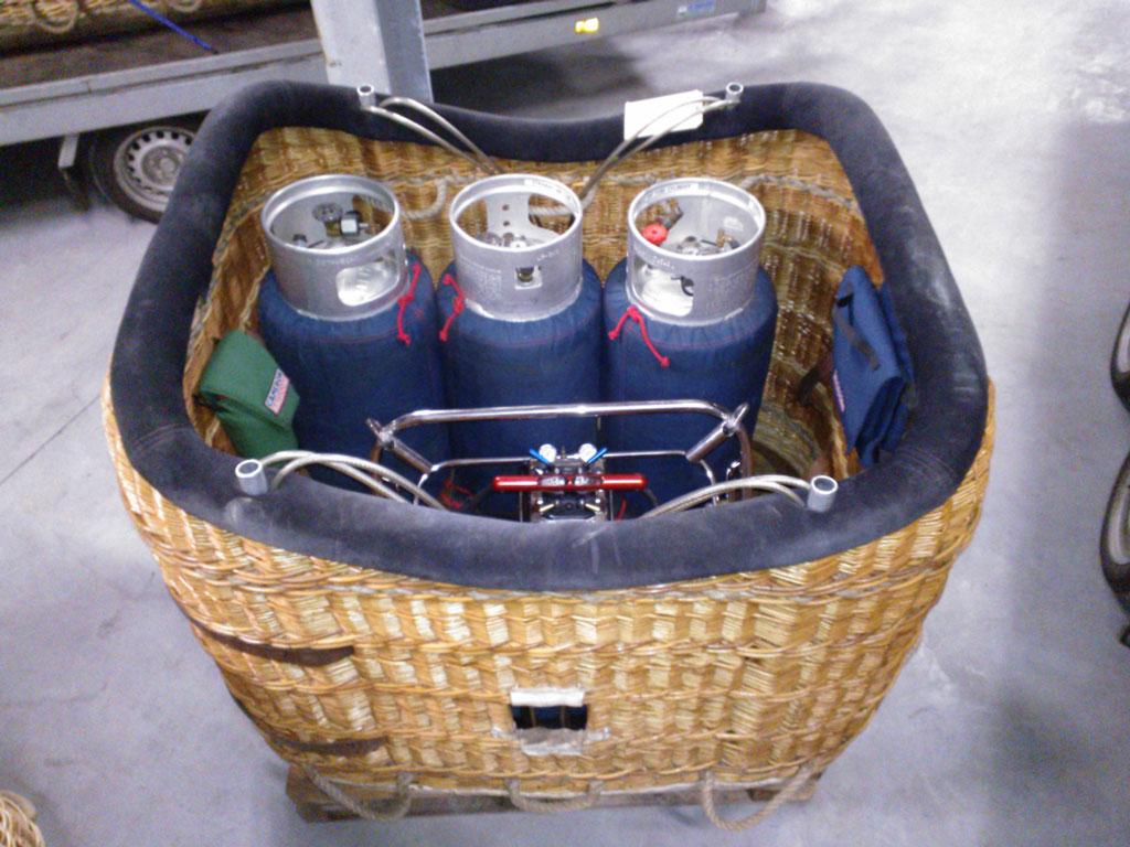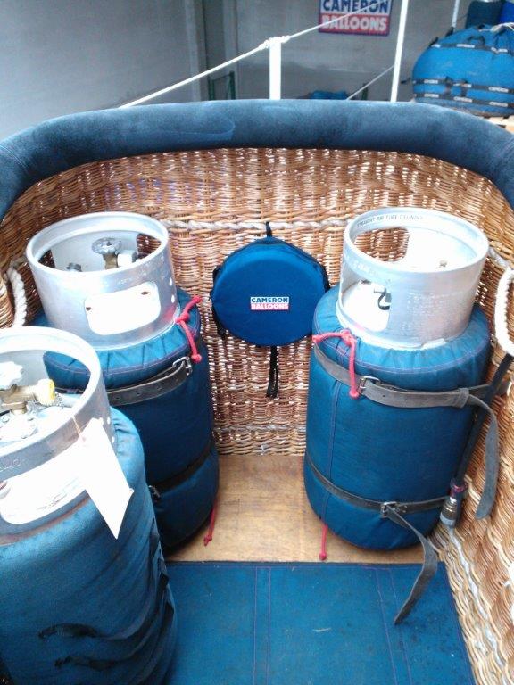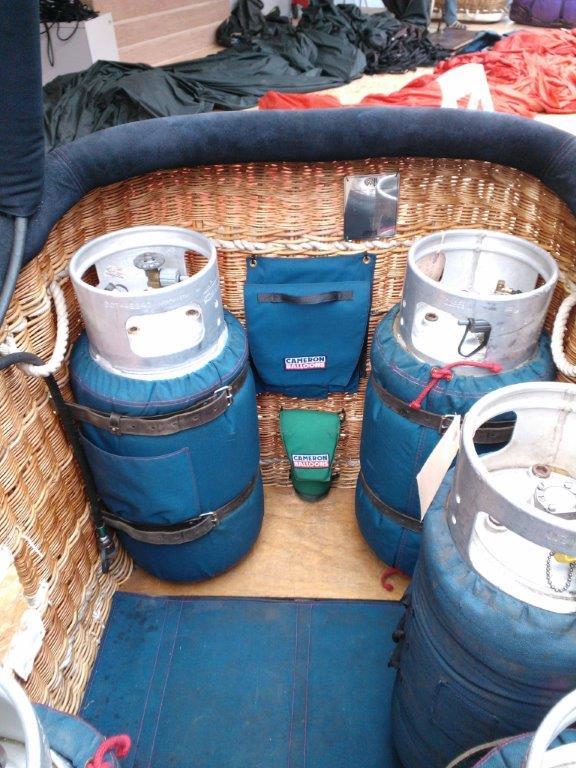 Cameron CB300-3A Aristocrat 77-84 basket with black suede top rim, only 50 flights. With cushion floor, drop line, karabiners, fire extinguisher. Cameron Single (that-thinks-its-a-double) Shadow burner, only 50 flights. Liquid pilot lights, new hoses January 2013. Complete service (new O-rings, KSP125) in January 2013. 5x CB 250 Aluminium 40 liter Worthington tanks with padded covers. In perfect condition, all with valid PRV and PPT.