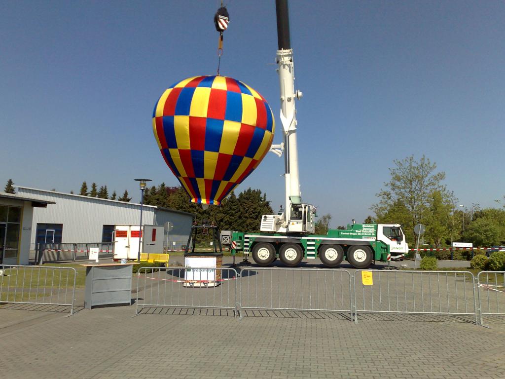 Complete balloon for use with a mobile crane. 1x colorful envelope, with banner possibilities, spotlight, fan, power set, steel rope suspension, paperwork. 2x Single T basket for 10 persons.