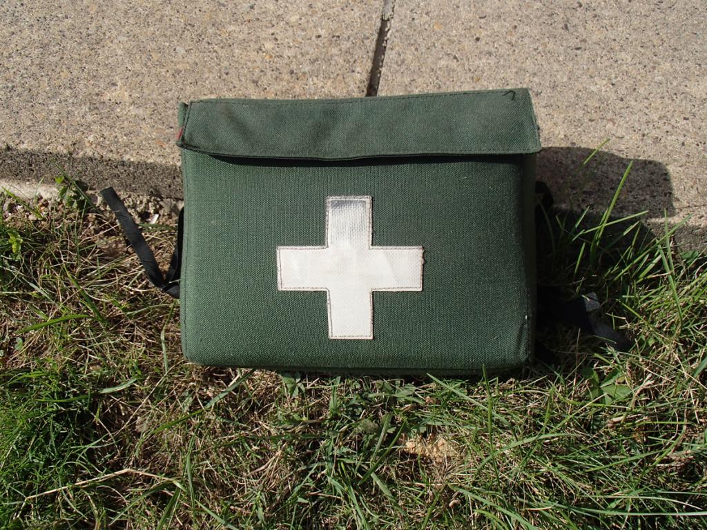 First Aid kit bag, green with secondary red inner bag full of first aid equipment - although a lot is out of date / should be replaced.
