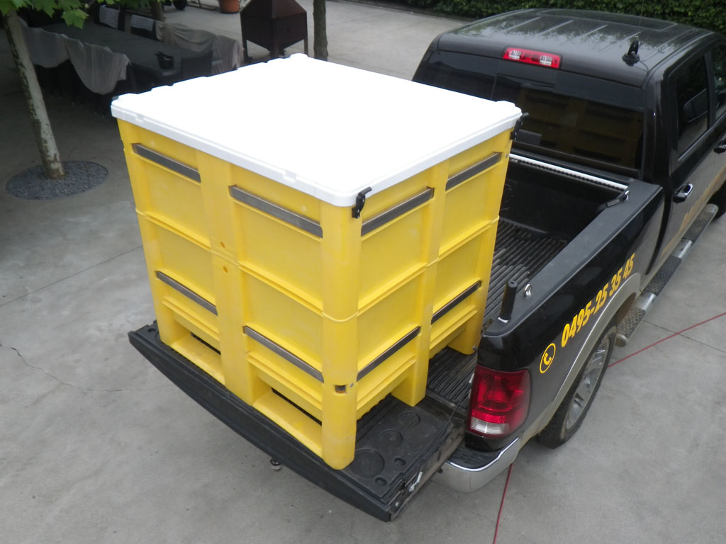 Transport box for balloon, very strong and waterproof. Reinforced with stainless steel bars. Perfect for safe and dry transport of your balloon by sea- or air-freight or on open trailer. Inside dimensions: L 92cm x W 111cm x H 101cm. Outside dimensions L 104cm x W 120cm x H 119cm. Weight around 45 kilograms. Volume: 1000 L. Custom made for transport of liquids but never used. These boxes will never been produced anymore. Limited stock.