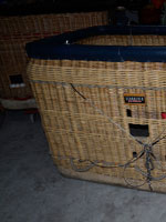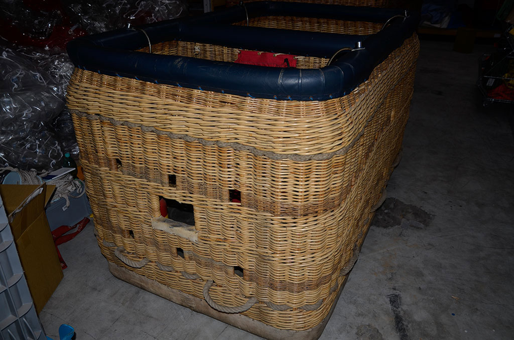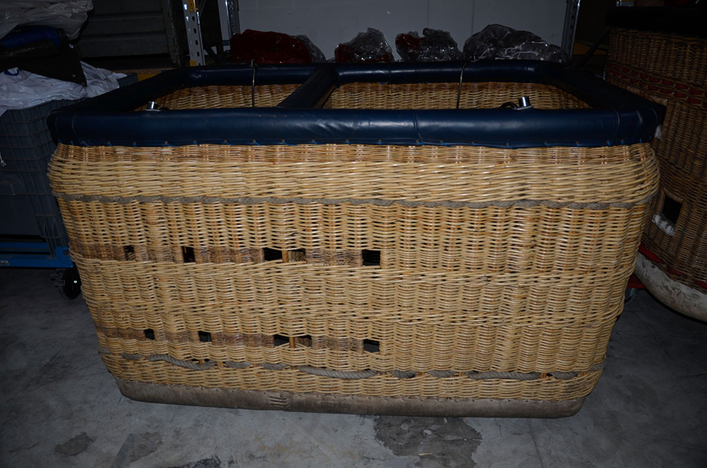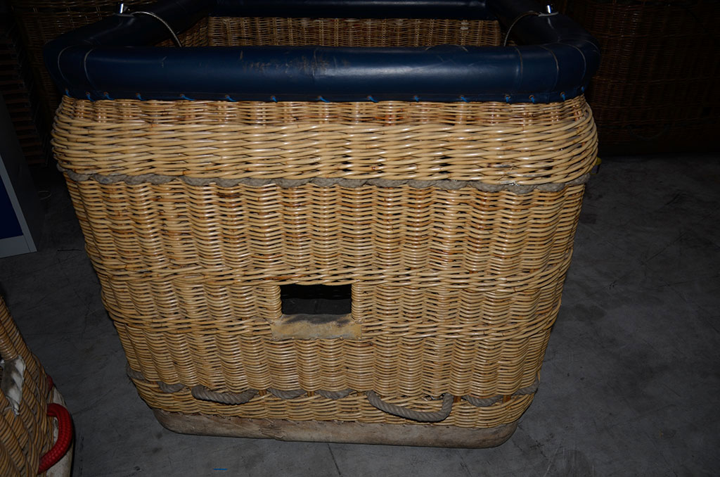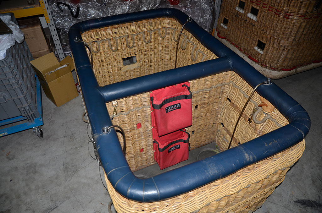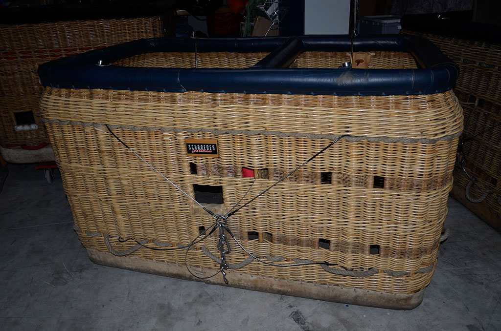 Schroeder VI basket, built 1999, approximately 300 flights. Blue leather top rim, Schroeder rope for quick release, fire extinguisher and cushion floors. Basket comes with fresh EASA Form One. Suitable FB6 double burner is also for sale.