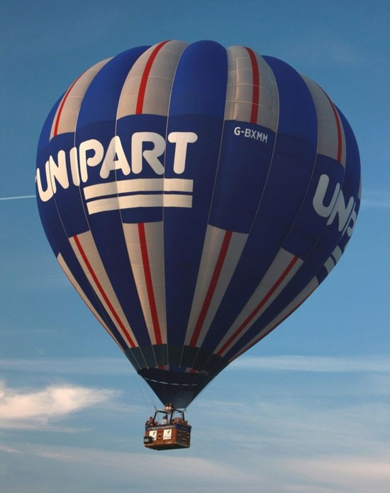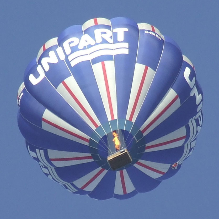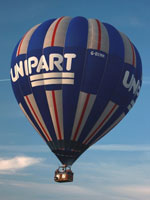 G-BXMM, Cameron A-180. Built 1997, 160:30 hrs. 50% hyperlast, RDS, double turning vents. Unipart artwork can stay. Cameron Double T basket with woven floor (CB754) with black suede top rim and pole covers. Navy cushion floor and side wall padding. Fire extinguisher, first aid kit, pilot restraint harness, quick release, drop line. Triple Cameron burner (2x Shadow, 1x Stealth) with liquid pilot lights (CB2289), TEMA fittings, nomex heat shields. Custom built covered tandem axle trailer which can travel either closed or with basket rigged. Comes with full CofA / ARC or export CofA. In excellent condition. 4x 60L tanks may also be available.