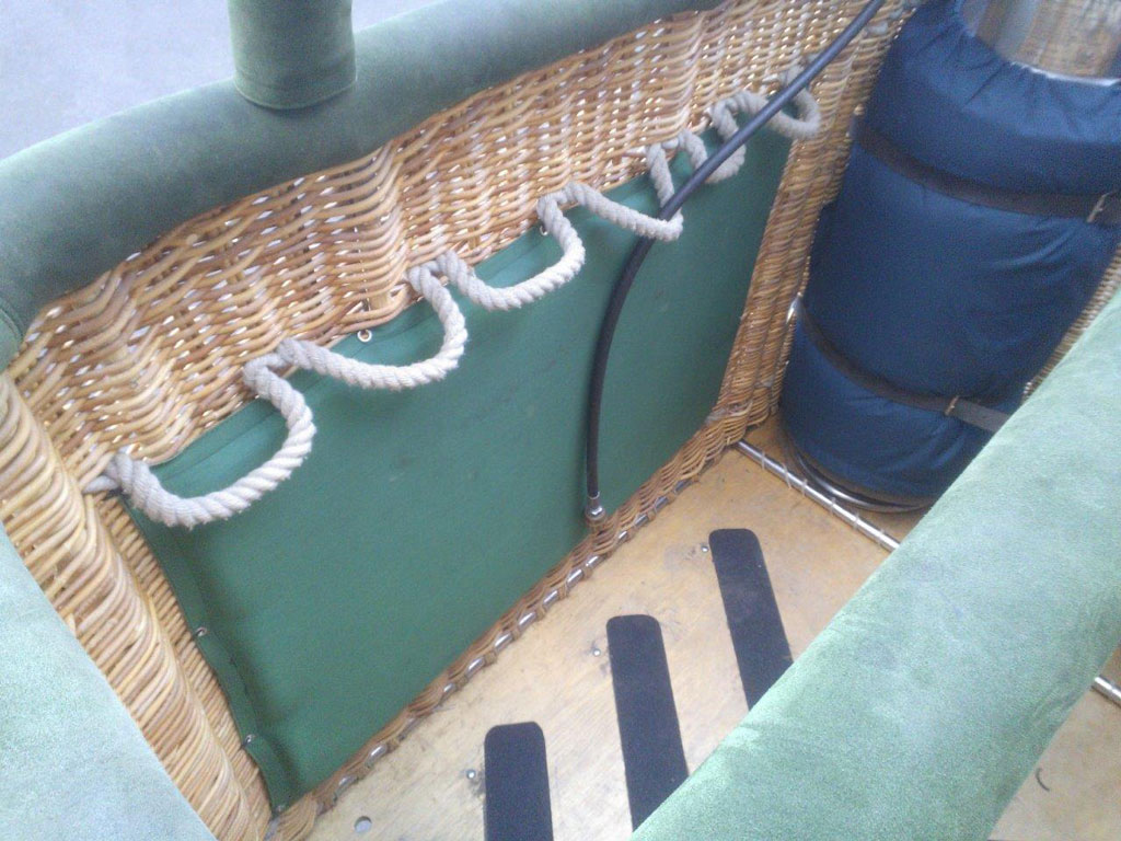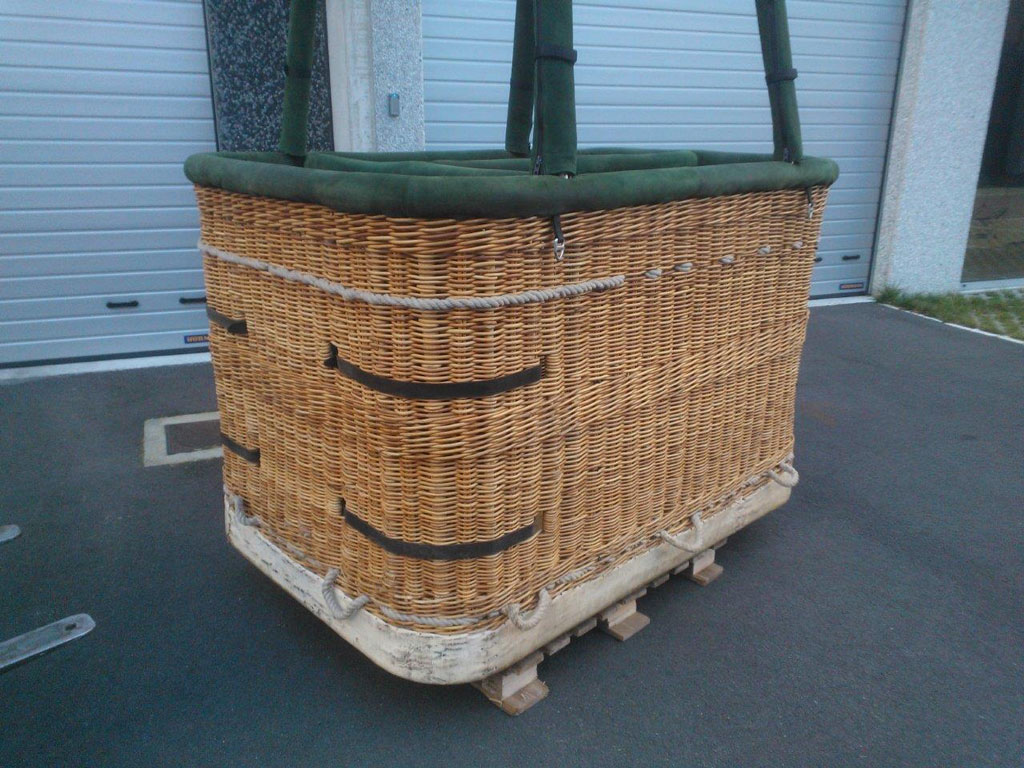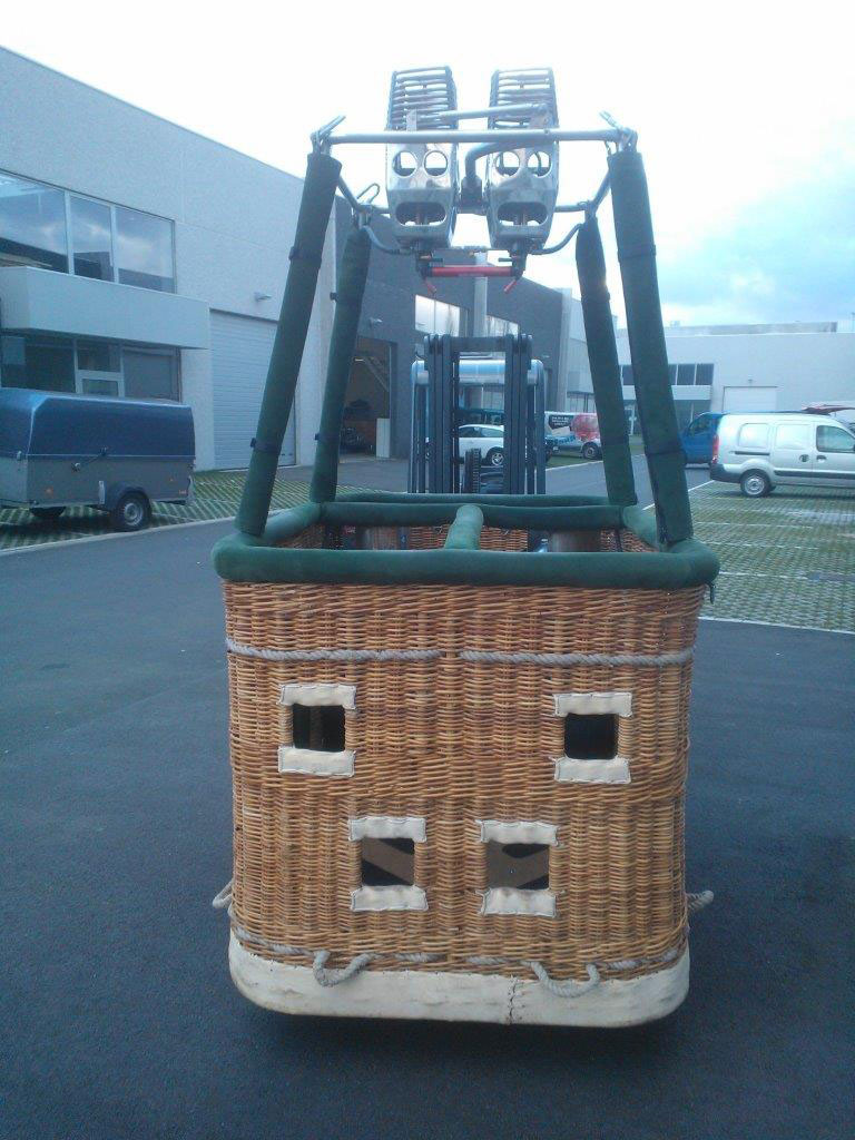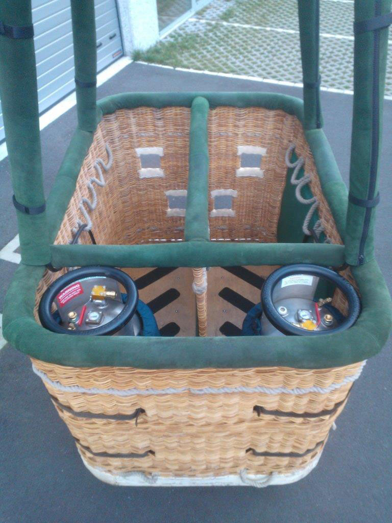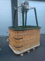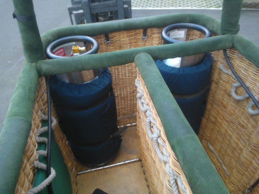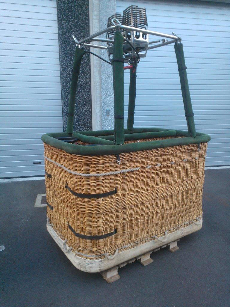 Cameron 140/160T bottom end. CB8200 single T solid floor basket, outside dimensions 1.80m x 1.30m, built 2006, Green suede top rim and pole covers. Side wall padding. All cane weave. 1 small compartment which fits 3 big tanks or 2 big tanks + 1 pilot, and 2 passenger compartments. Weighs 125kg. Cameron double Super Shadow burner, built 2006, liquid pilot lights, REGO fittings, in pneumatic adjustable gimbal block frame. 2x Cameron CB959 (87L) cylinders, built 1998, REGO fittings, quick shut off valves. PPT/PRV/INT valid until 08/2018. Complete bottom end fits inside a high sided 3.0m Westfalia trailer, together with an envelope and inflation fan.