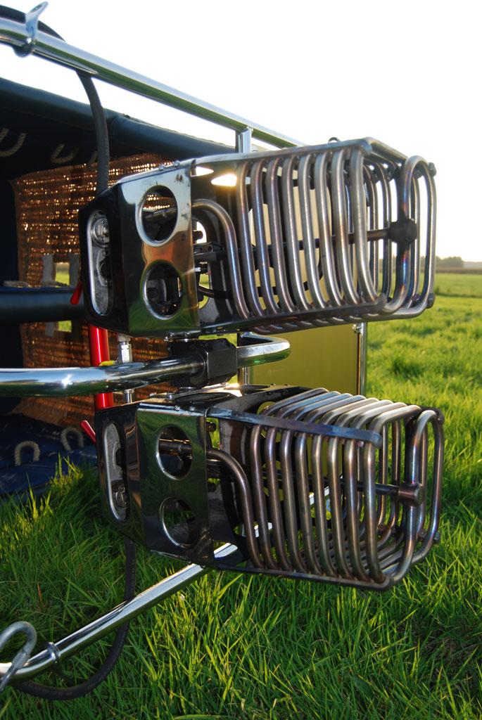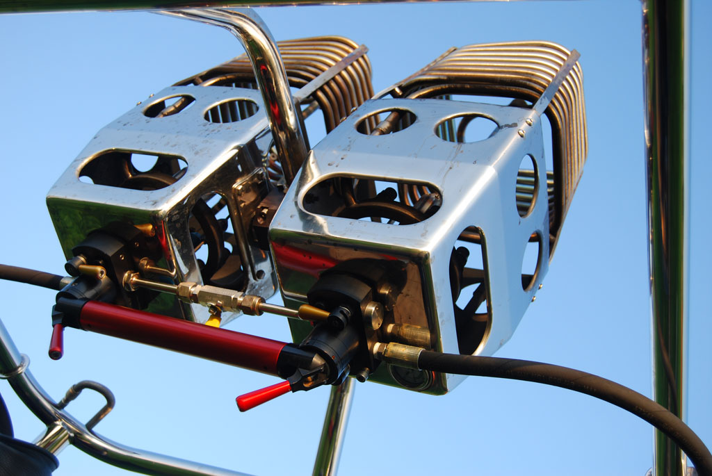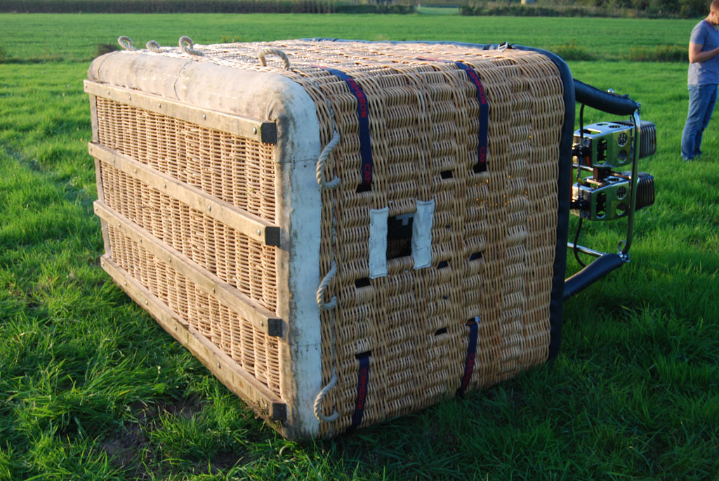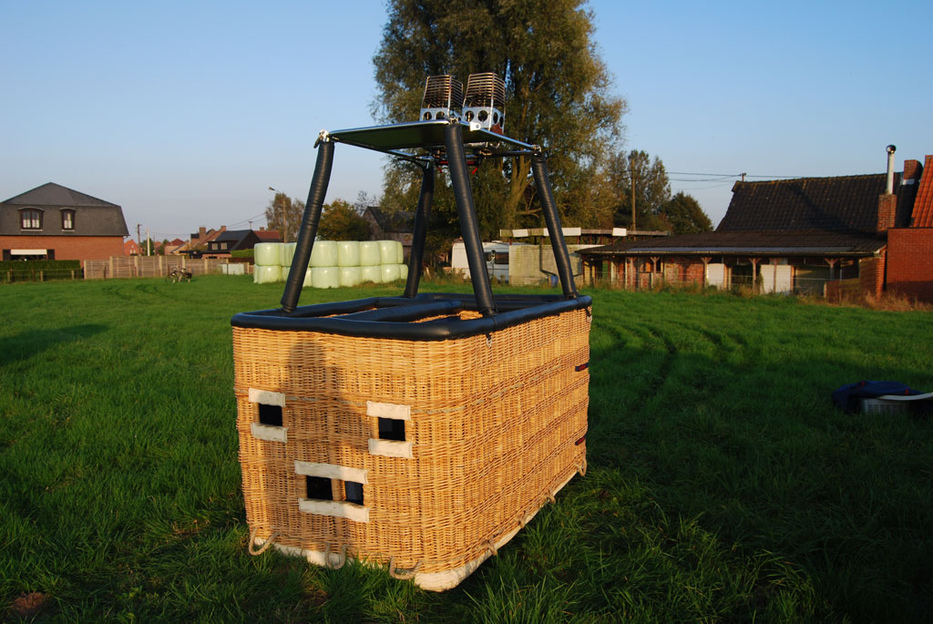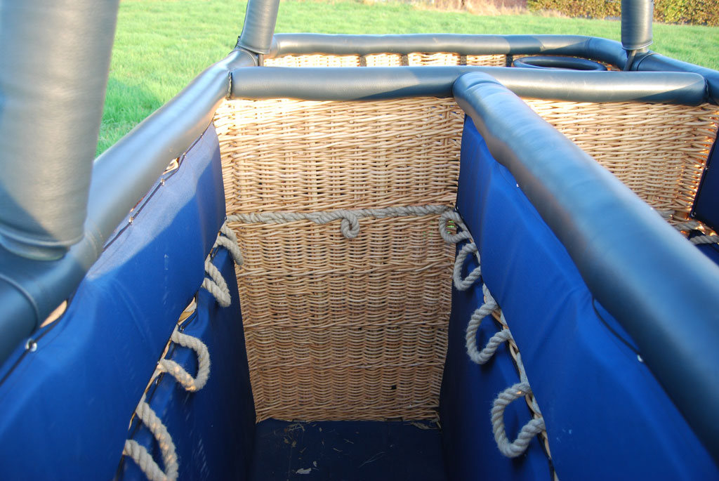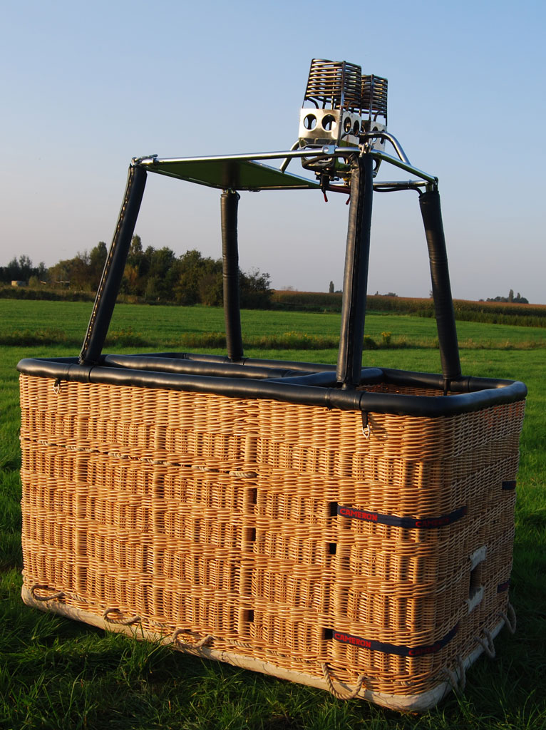 Cameron 140T basket, built 2010, 97 flights, 104:25 hrs. Woven floor, navy leather top rim. Navy side wall padding and cushion floor. First aid kit, fire extinguisher, drop line, smart vent bag, complete pilot restraint harness and 8 navy nylon tank straps. Cameron double Shadow burner, built 2010, 97 flights, 104:25 hrs. In gimbal block frame with metal heat shield, liquid pilot lights, hose protection. In nearly new condition, immediately available.