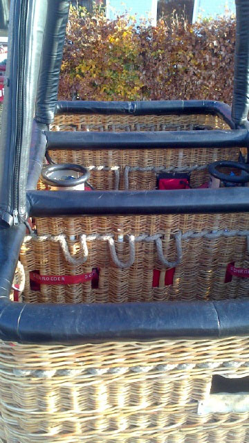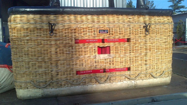 Schroeder VIII/9 basket for pilot + 8 passengers. Built 2004, black leather top rim. Dimensions: 2.50m long x 1.45m wide x 1.20m high. Cushion floor, drop line, fire extinguisher, quick release.