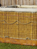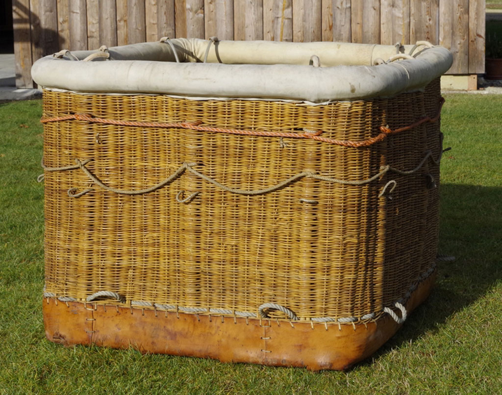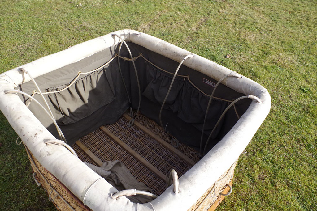 Worner gas balloon basket, built 1990, 1.50m x 1.25m, suitable for 6 persons. Cushion floor, sand bag with shovel, trail rope bag with quick-opening mechanism. In good condition.