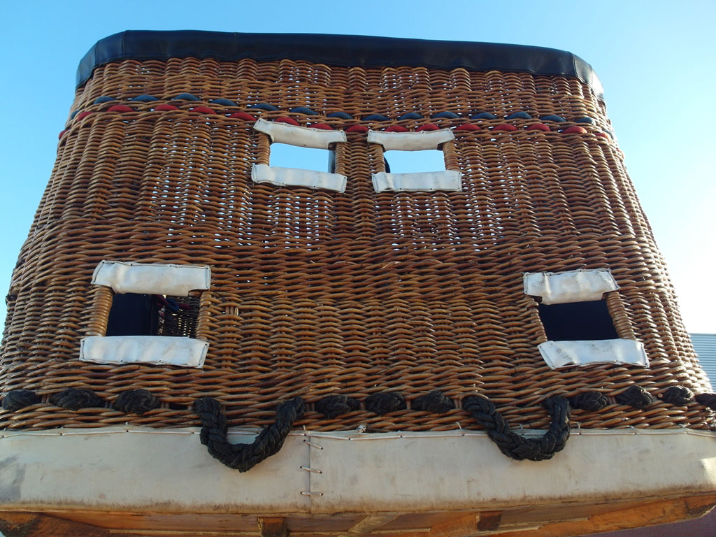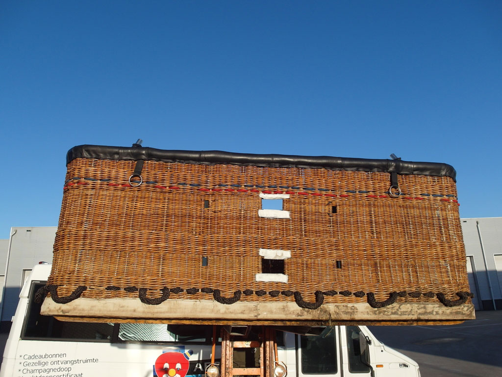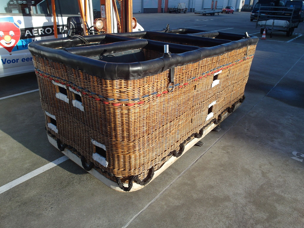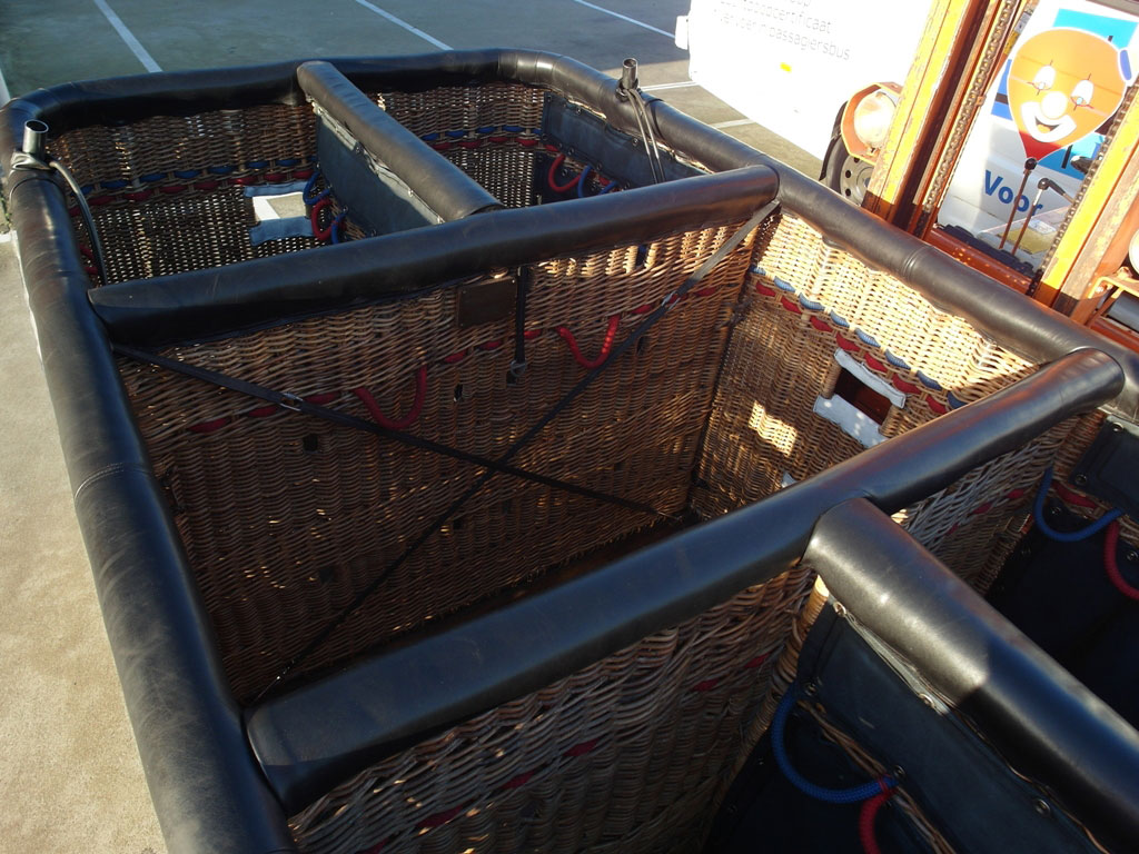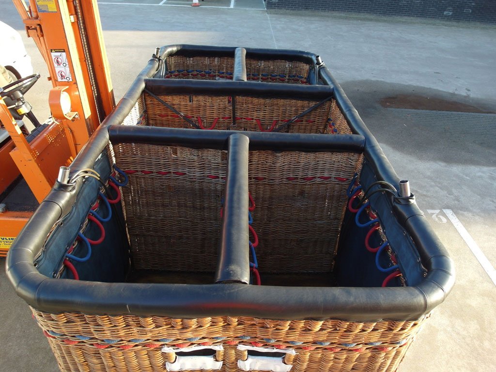 Lindstrand double T basket, built 1993, approximately 3.00m x 1.60m. For pilot + 12 passengers. Black leather top rim and pole covers, side wall padding, cushion floor.