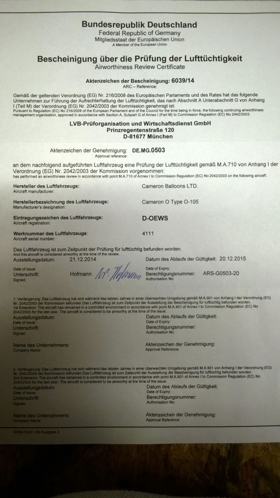 D-OEWS, Cameron O-105, built 1997. 362:20 hrs, 309 flights. Hyperlast top (parachute + 6 rows). One owner since new. Artwork can stay. Thunder & Colt solid floor 105 basket with red leather top rim. 4 poles, 4 covers, 4 karabiners. New 1kg fire extinguisher, in pocket. Document bag. Thunder & Colt double Magnum C3 burner with liquid pilot lights, new hoses, new REGO fittings. 4x Aluminium Worthington cylinders with covers. REGO fittings. PRV/PPT valid until 02/2025. 5.0 HP inflation fan with perfect prop, cage and frame. Completely serviced by official Honda center in January 2015. Envelope in reasonable condition. Bottom end, tanks and inflation fan in very good condition. Comes with certificate of de-registration and valid ARC (until December 20th, 2015). Immediately available. Envelope pictures taken on April 8th, 2015.