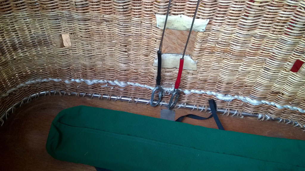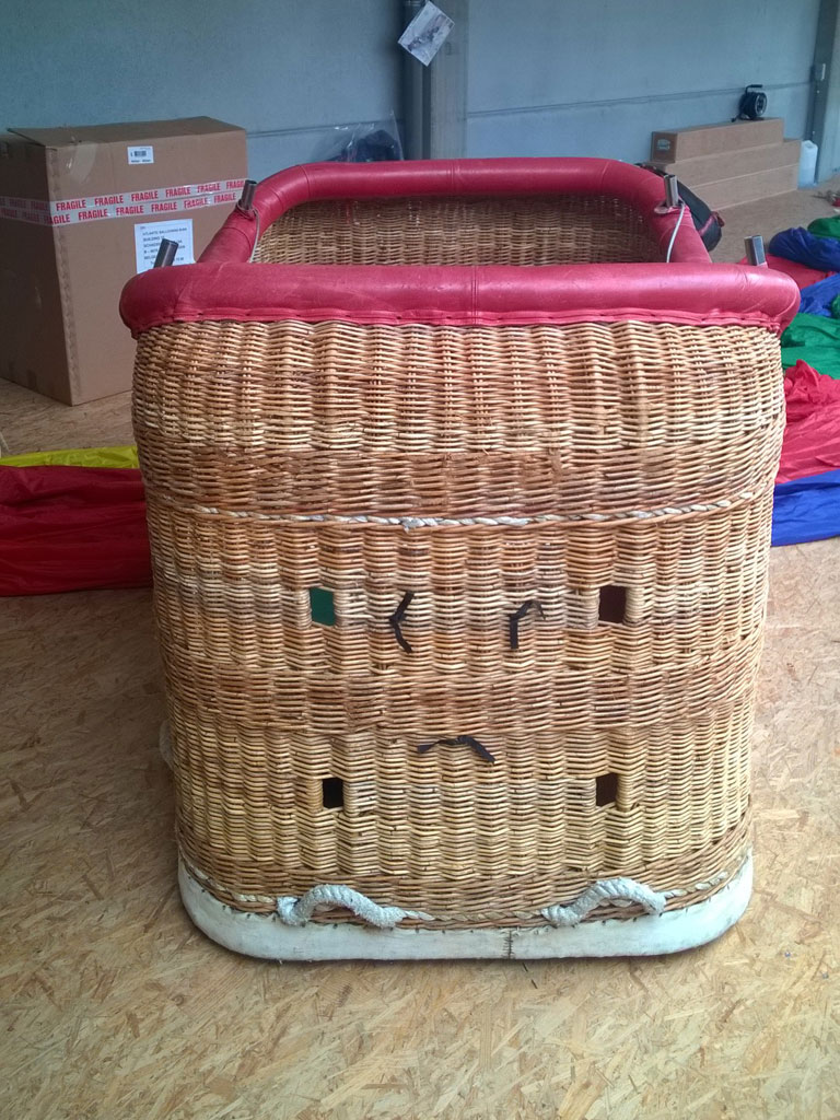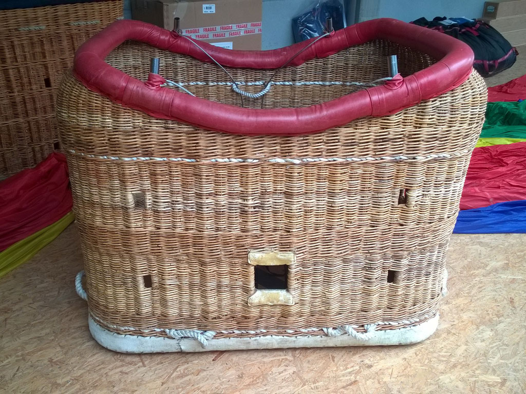 Thunder & Colt 105 basket, with solid floor and red leather top rim. 4 karabiners, fire extinguisher in pocket and document pouch. In good condition. Comes with fresh EASA Form 1. Immediately available.