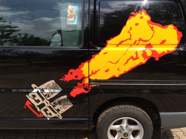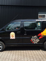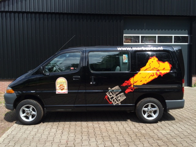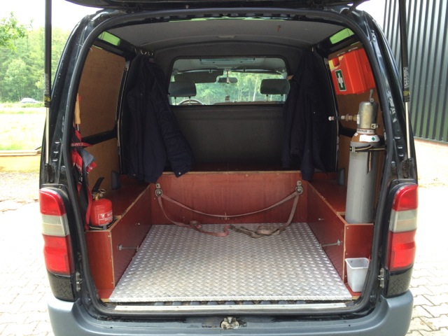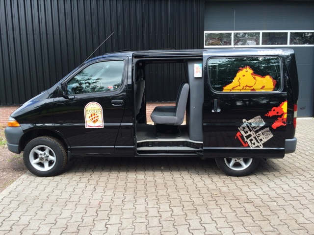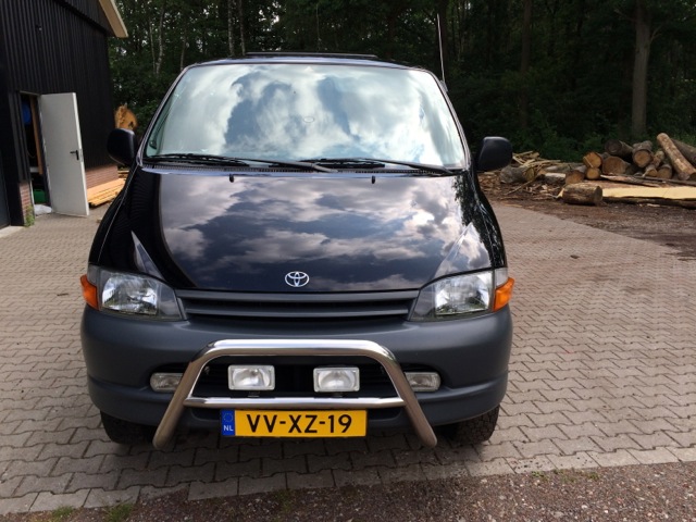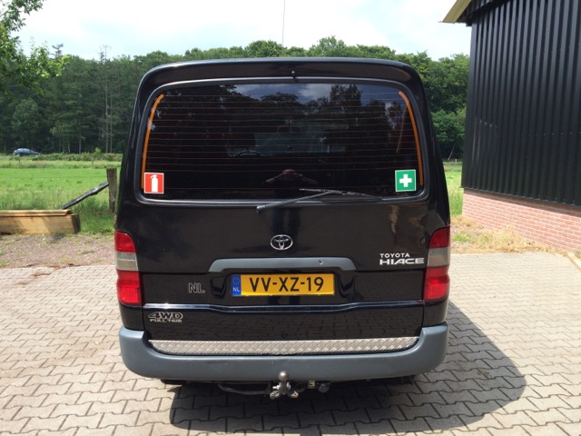Toyota Hiace 4WD, black, 225.000 km. 2.5L turbo diesel engine. 2 electrical sliding roofs, 2 sliding doors on the side. 6 seats. Very suitable and equipped for ballooning with air band radio, eye for quick release and towbar. Tires are OK. 100% maintained by Toyota dealer. In very nice condition, no problems or defects!