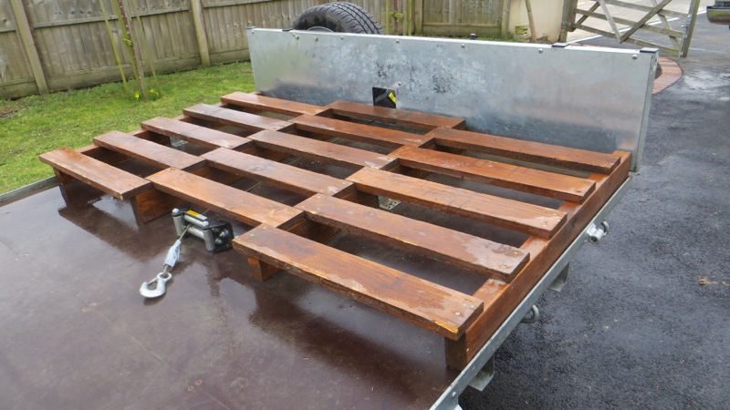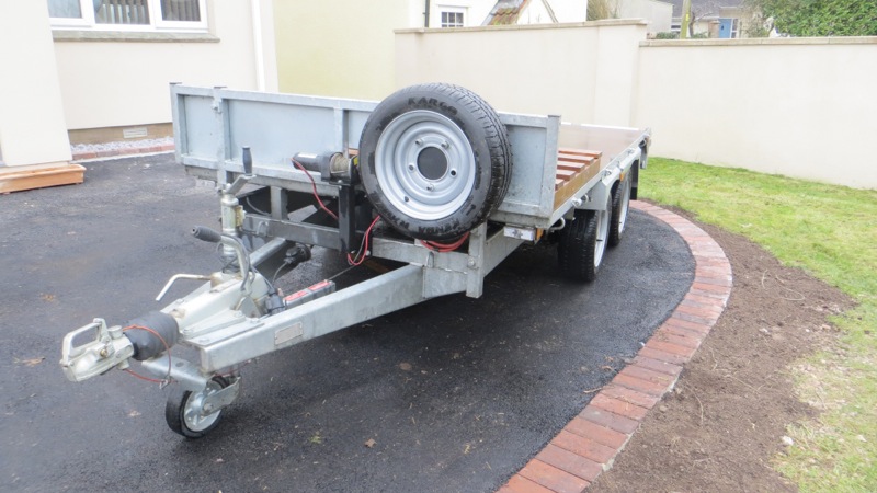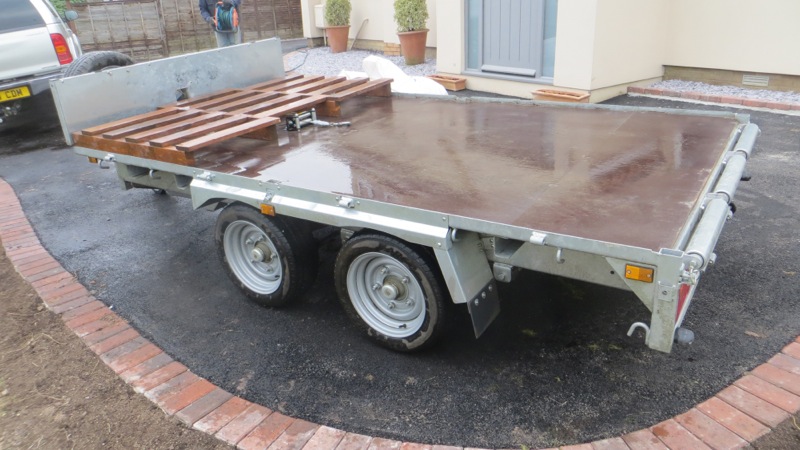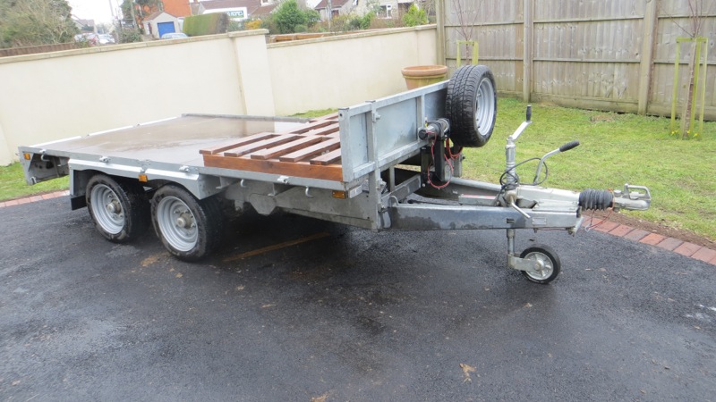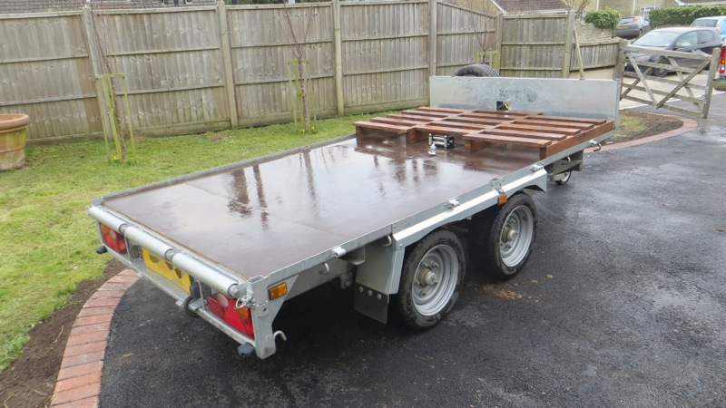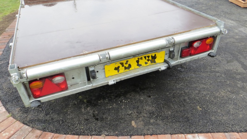 Purpose built Indespension tandem axle trailer, 1.65m x 3.00m, with electric winch and rollers on rear for easy (un)loading. PVC covers for basket and envelope (105 - 133). In very good condition.