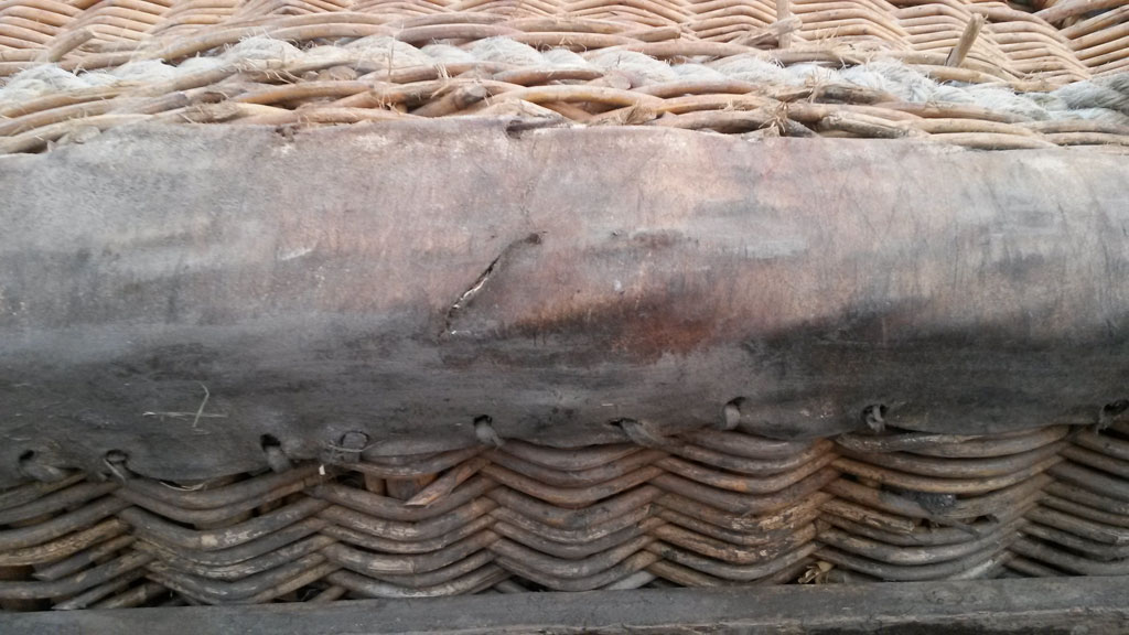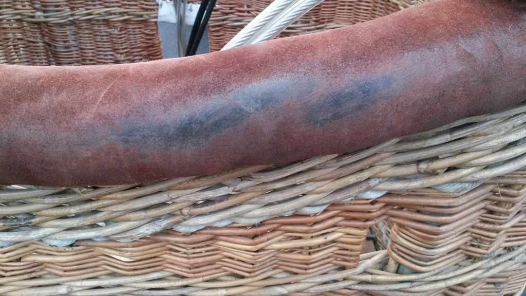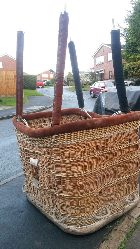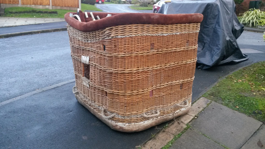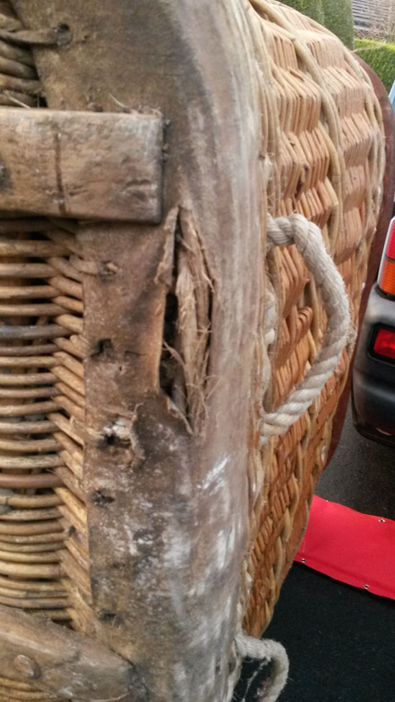 Cameron 77/90 basket, 1.30m x 1.10m, brown suede top rim. Including poles and pole covers, however 2 of them are in a different color. Repairs needed before it could pass CofA inspection, there is one damage to suede top rim (see photo) and raw hide (see other photo).