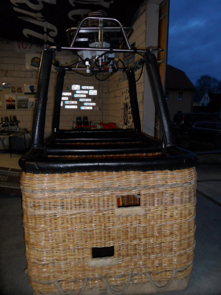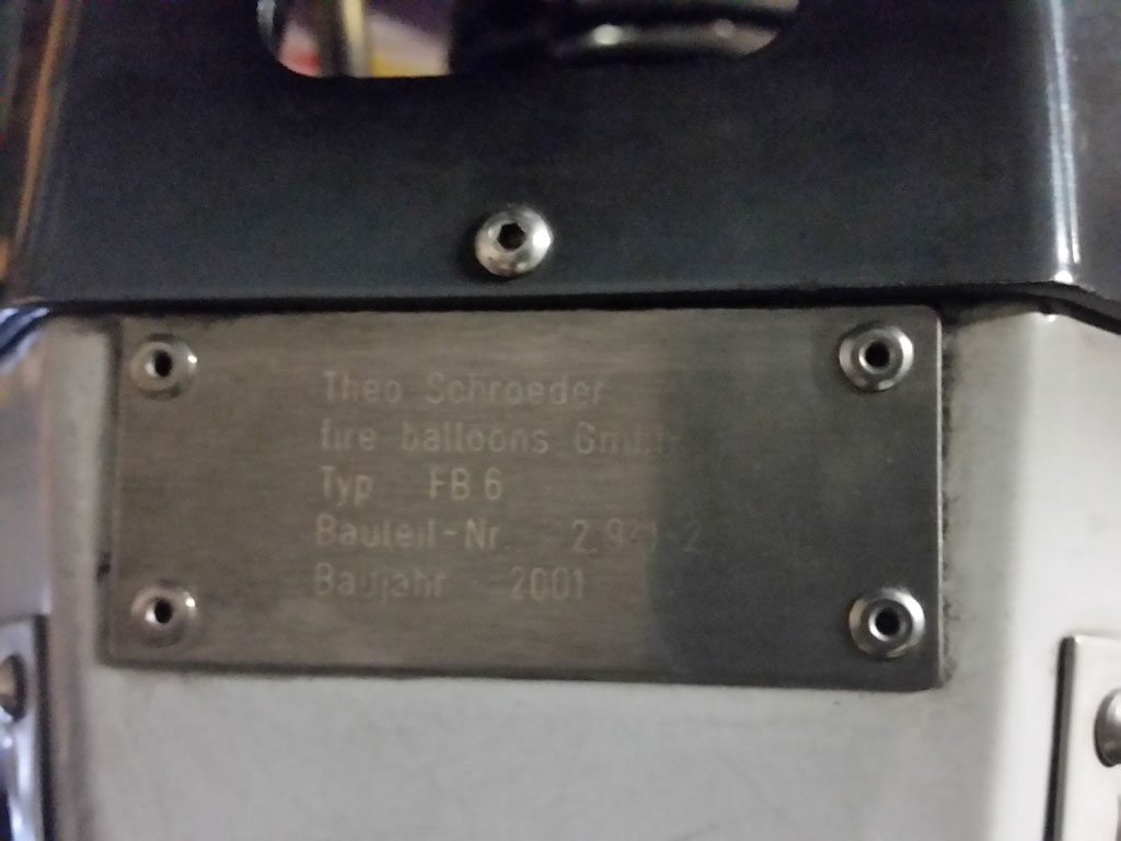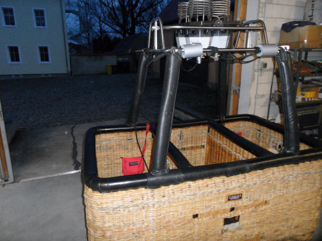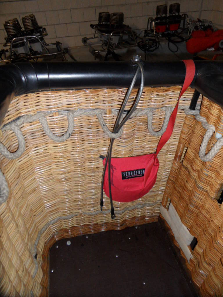 Schroeder VIII basket, 2.45m x 1.45m. Built 2005, black leather top rim, drop line, quick release, side wall padding in passenger compartment, bag with fire blanket and first aid kit, Dittel basket antenna with bag. In very good condition. Schroeder triple FB6 burner, built 2001, height adjustable frame. Inspected with EASA Form 1 December 2015.