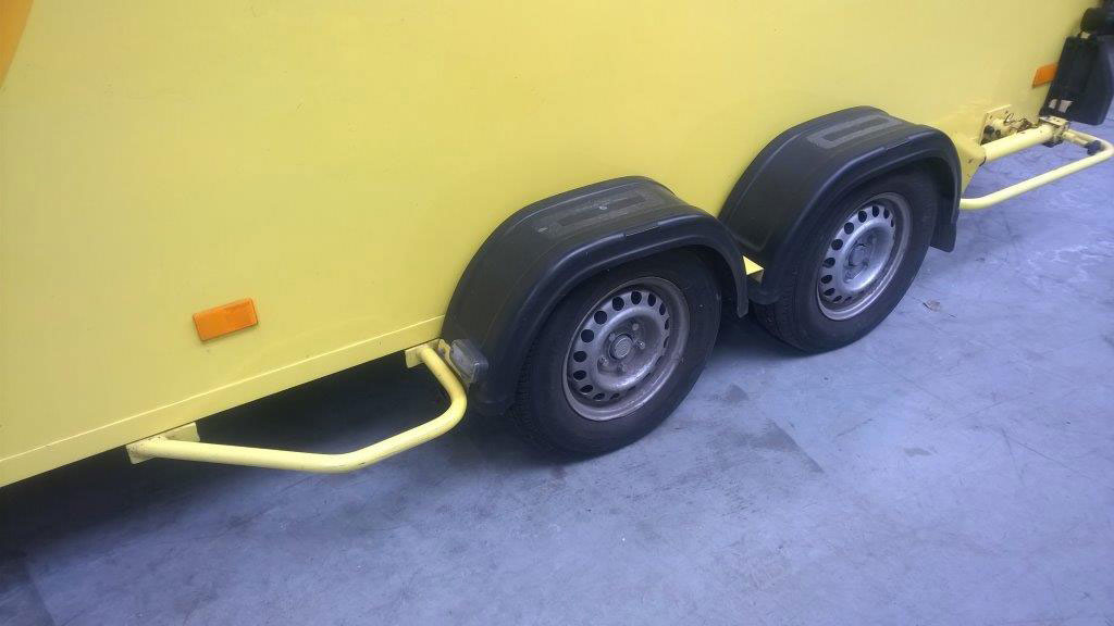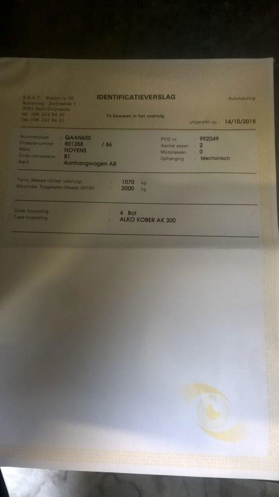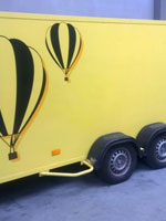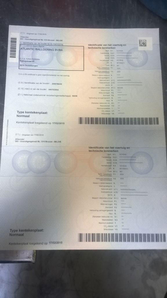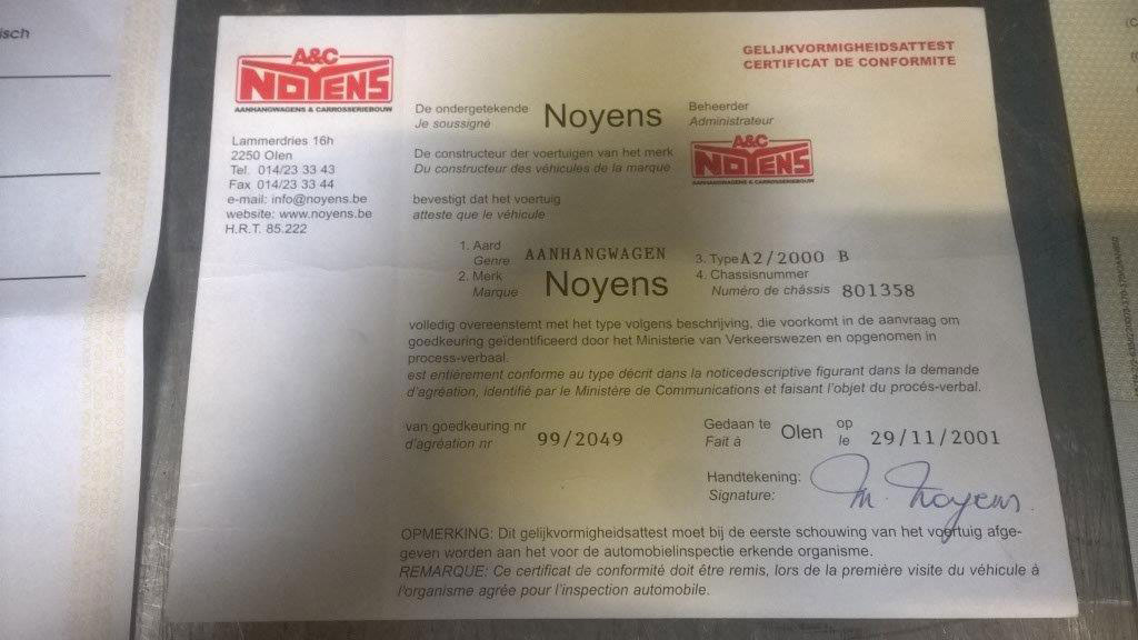 Tandem axle Noyens balloon trailer, built 11/2001. Used for Cameron 160 with Cameron 140T basket. Inner dimensions: 3.90m x 1.65m. Empty weight 1070 kg. Can be loaded up to 2000 kg. Strong locks and hinges. 2 original keys for back door included. Good tyres, spare wheel included. Metal floor for easy sliding. Rails on side for securing equipment during transport (straps included). Some stains on the right and back side, where artwork has been removed. Documents include Certificate of Conformity. In very good condition. Immediately available.