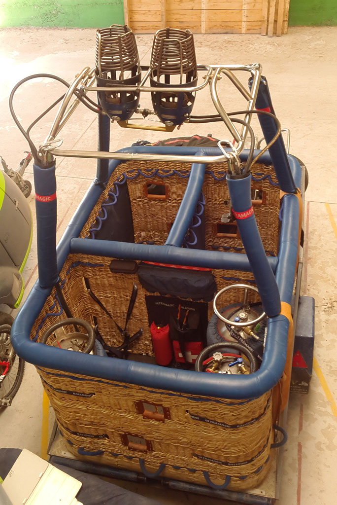 EC-IMN Ultramagic T-150, built 2003, 300 hrs. 65hrs since rebuild all grey panels in 2012 by Ultramagic factory. Turning vents, RDS. 3/4 (top red and grey) hyperlast, rest ripstop nylon. Ultramagic C7 T-partitioned basket, built July 2015, 15 hrs. 2.00m x 1.40m, for 6 passengers + pilot. Blue leather top rim, cushion floor, side wall padding. Including fire extinguisher and pilot restraint harness. Ultramagic Mk10 double burner, built 2000, approx 200 hrs. Vapour pilot lights, REGO fittings. 1x Ultramagic M30 cylinder, built 2012, Master, REGO fitting, quick shut off valve. Red cover, PRV/PPT/INT valid until 2017. 1x Ultramagic M30 cylinder, built 2000, Master, REGO fitting, quick shut off valve. Blue cover, PRV/PPT/INT valid until 2017. 1x Thunder & Colt V30 cylinder, built 1994, Slave, REGO fitting, quick shut off valve. Blue cover, PRV/PPT/INT valid until 2017. 9.0 HP inflation fan, Ultramagic, built 2005. Flip wheel stainless steel frame. Single axle trailer, built 2012, 3.10 x 1.70m, max load 1000 kg. ARC valid until 02/2017.