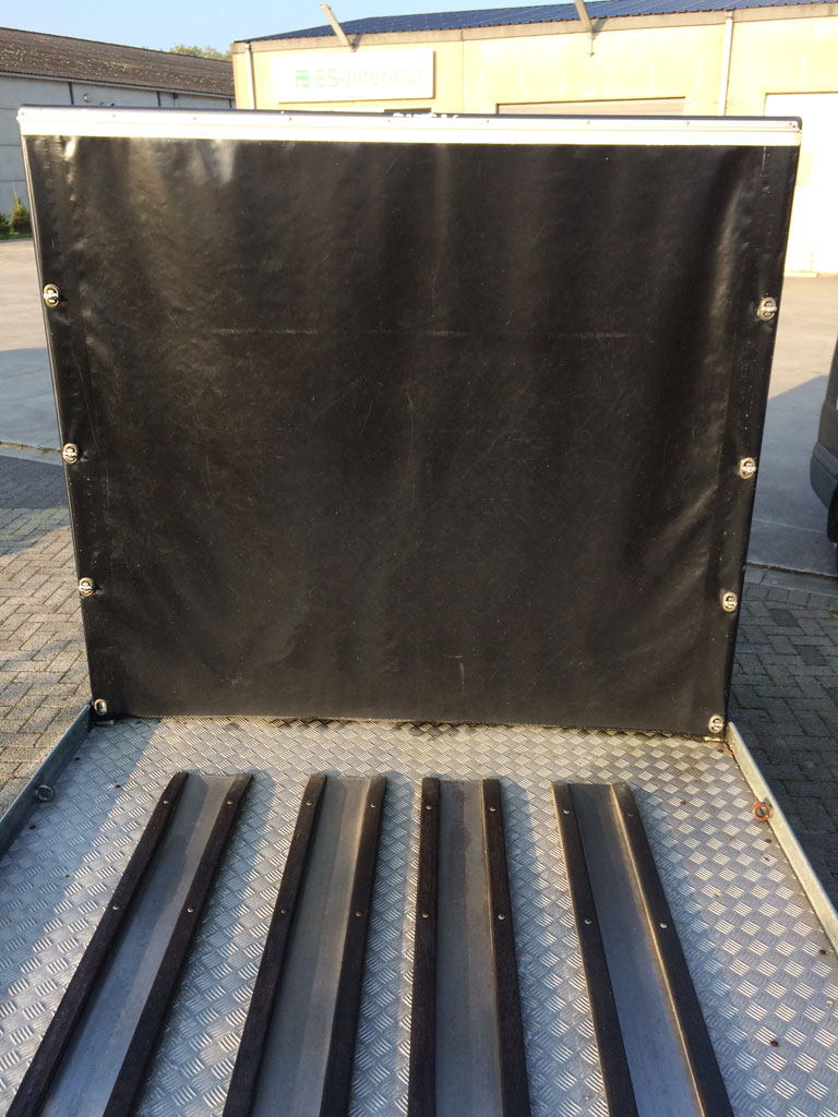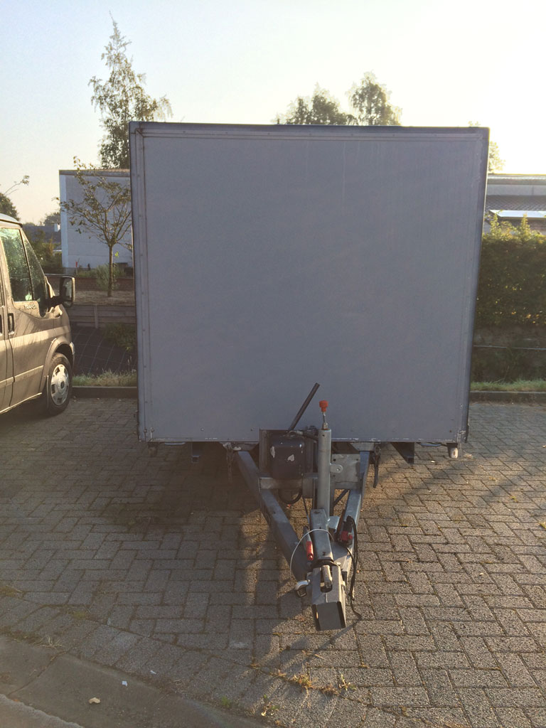 Tandem axle flatbed trailer with housing. Built 2005. Tiltable loading area for easy unloading. Loading area dimensions 4.55m x 2.00m. Housing dimensions 1.70m x 2.00m, 1.70m high. Used for TT basket of 2.70 x 1.70m.