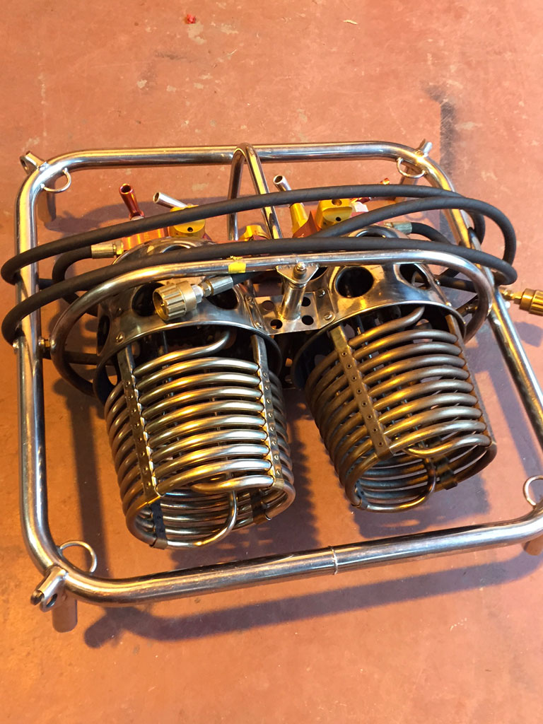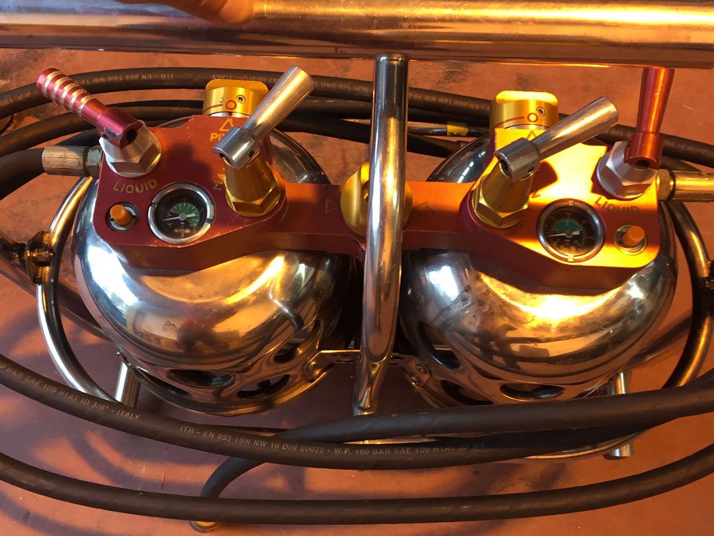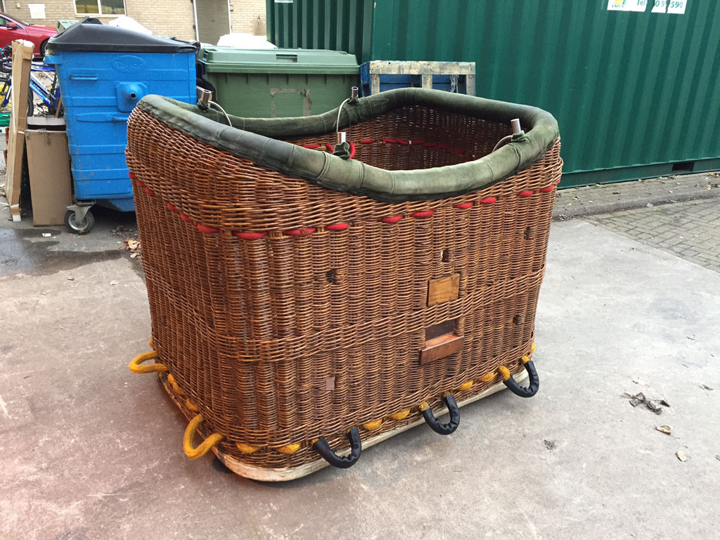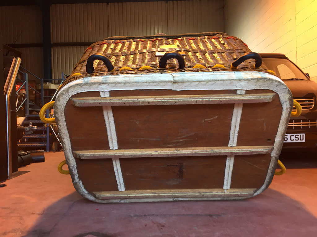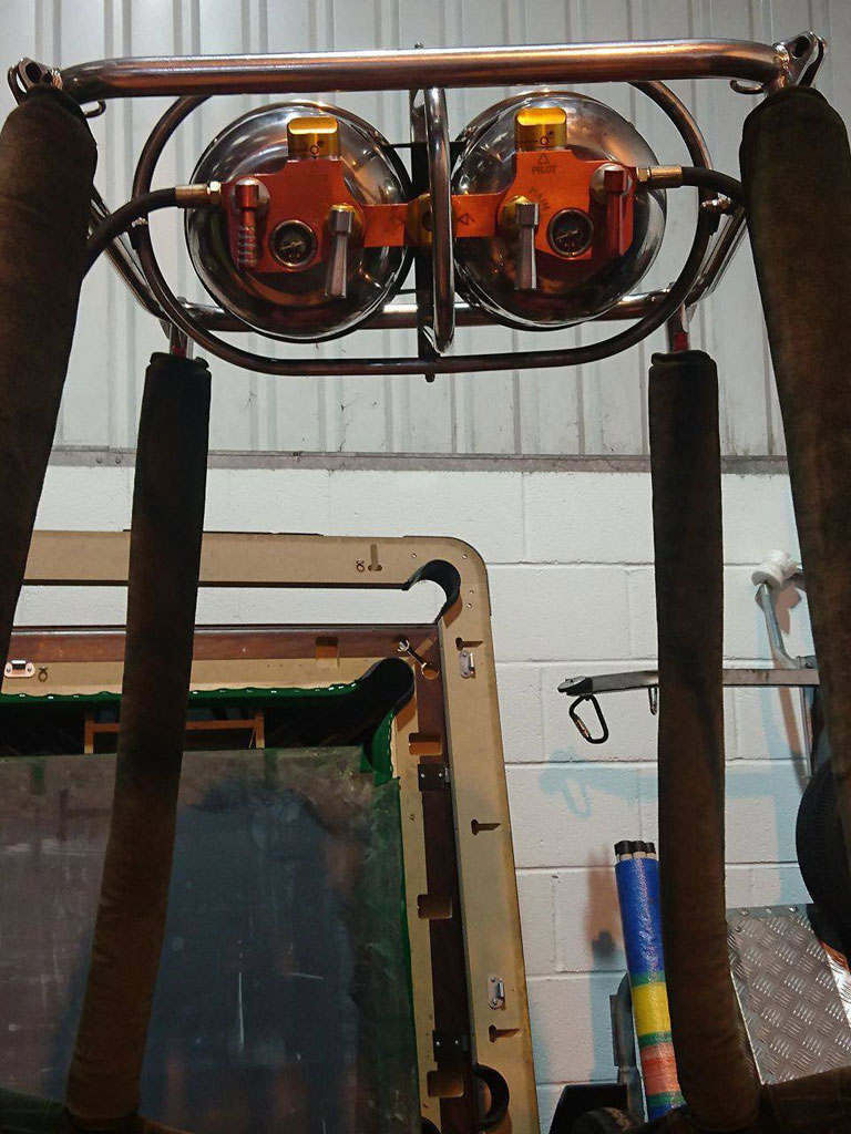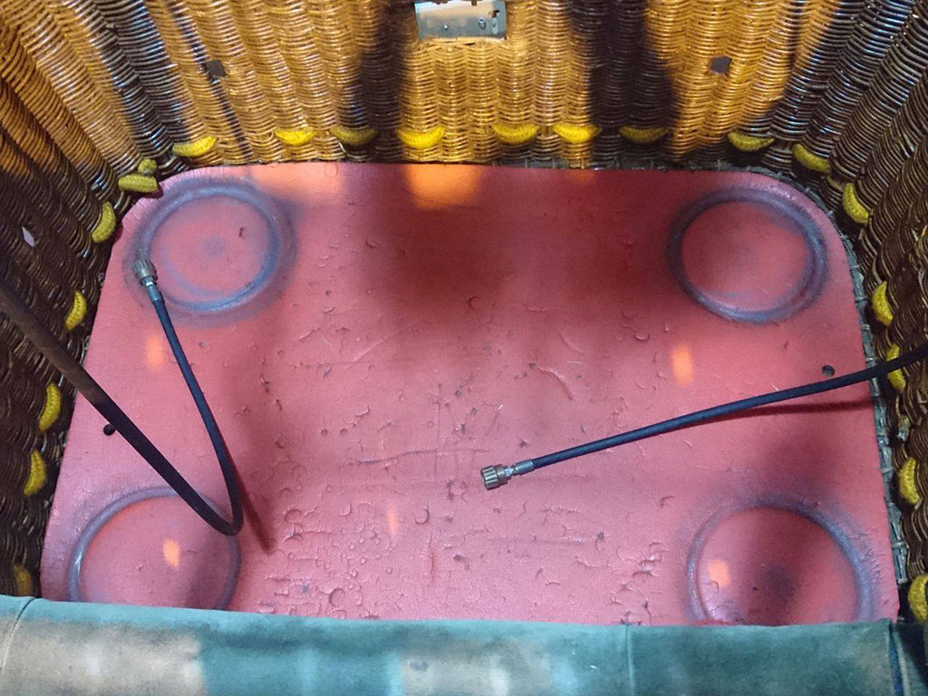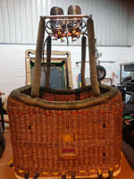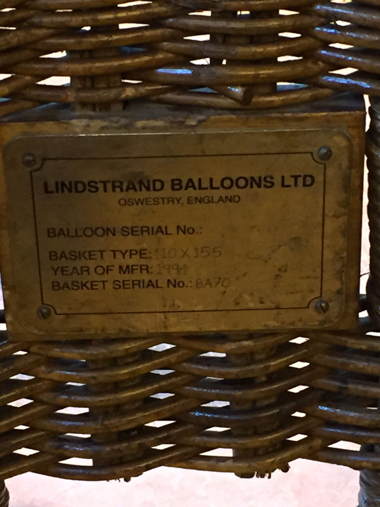 Lindstrand 1.10m x 1.55m swept top solid floor basket, built 1994, green suede top rim, cushion floor. Raw hide is in good condition. Lindstrand Jetstream double burner with good hoses with REGO fittings, standard frame. Right hand burner coil replaced in 2014.