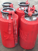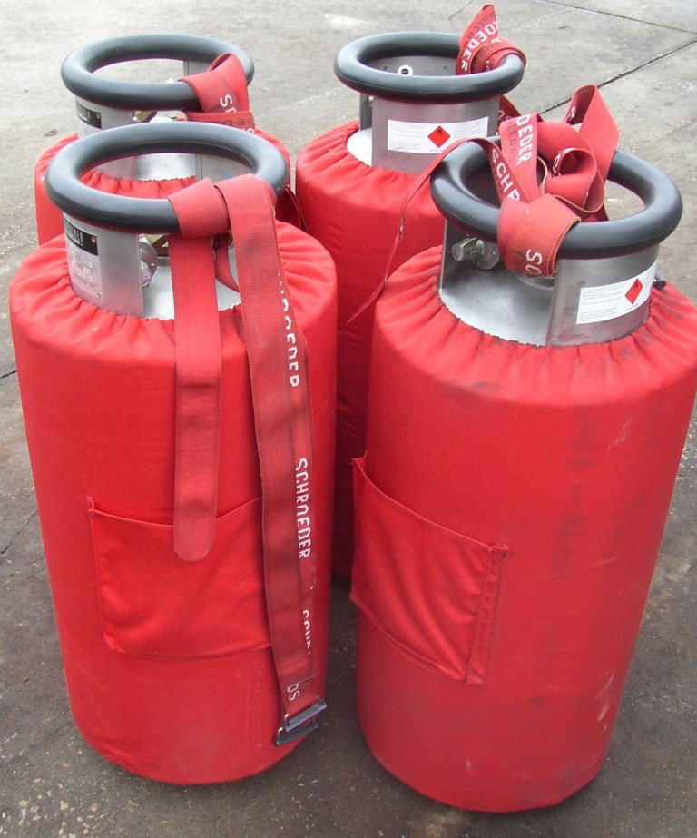 4x Schroeder VA70 cylinders, built 2012, REGO fittings, all master with Dynaquip fittings for vapour. PRV/PPT/INT valid until December 2022. With "Pi"-stamp, red covers. The shown tank straps are not included. Only used a few times. In perfect, as new condition, located in France.