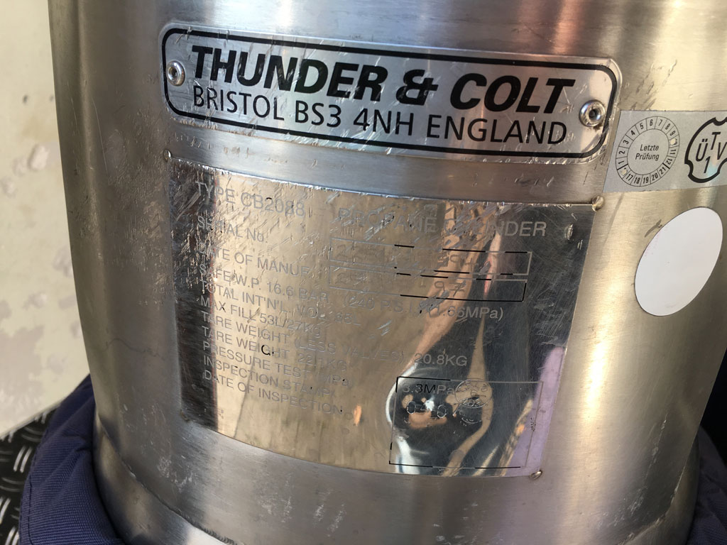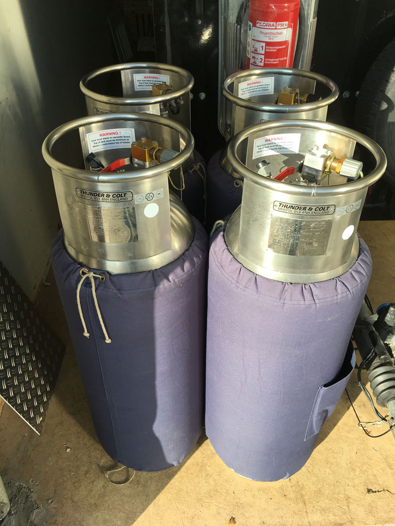 4x Thunder & Colt CB2088 cylinders, built 1997, usable volume 53 liter. Slave, 2 master valves can be included. REGO fittings, blue covers. PRV/PPT/INT valid until 10/2026.
