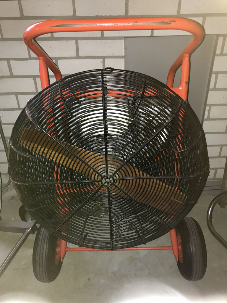5.0 HP inflation fan, built around 1995. Red steel fixed axle frame, wooden propeller.