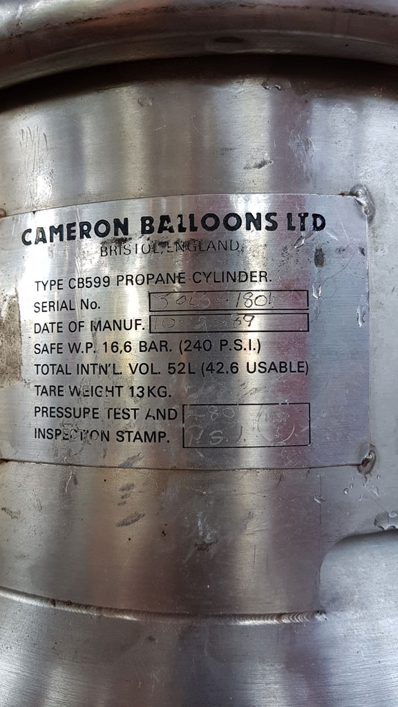 Cameron CB599 cylinder, built 1989, master, usable volume 42.6 liter. New red cover, REGO fitting. PRV/PPT/INT date unknown so needs new test.