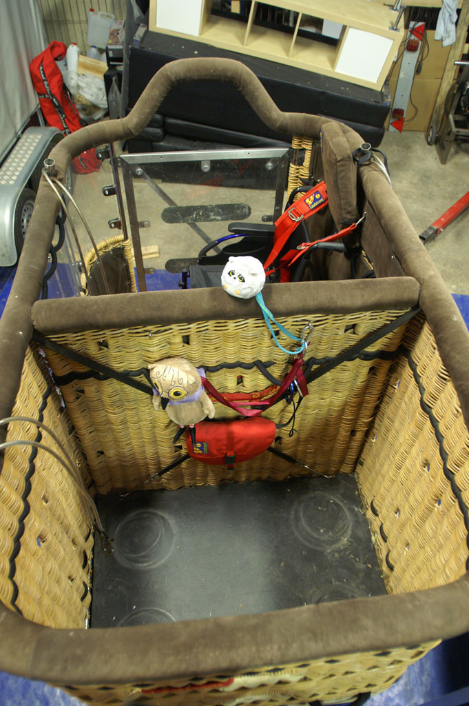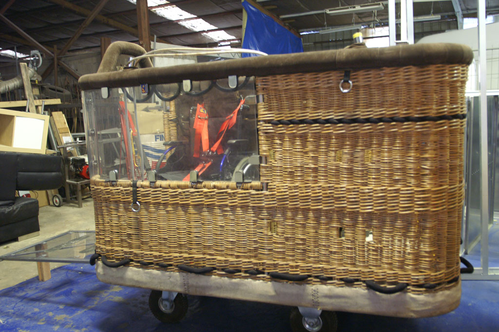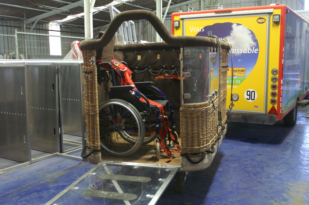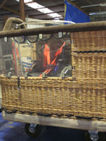 Lindstrand panoramic wheelchair basket, built 2010, 2.05m x 1.25m. Approximately 180 flights. Last inspected in September 2016. Plexiglass door, opening top to floor as well as plexiglass window in front of wheelchair. Burner frame and protective cover included. During transport, the basket can be safely attached in the trailer. Price when new € 13.000,-.