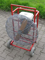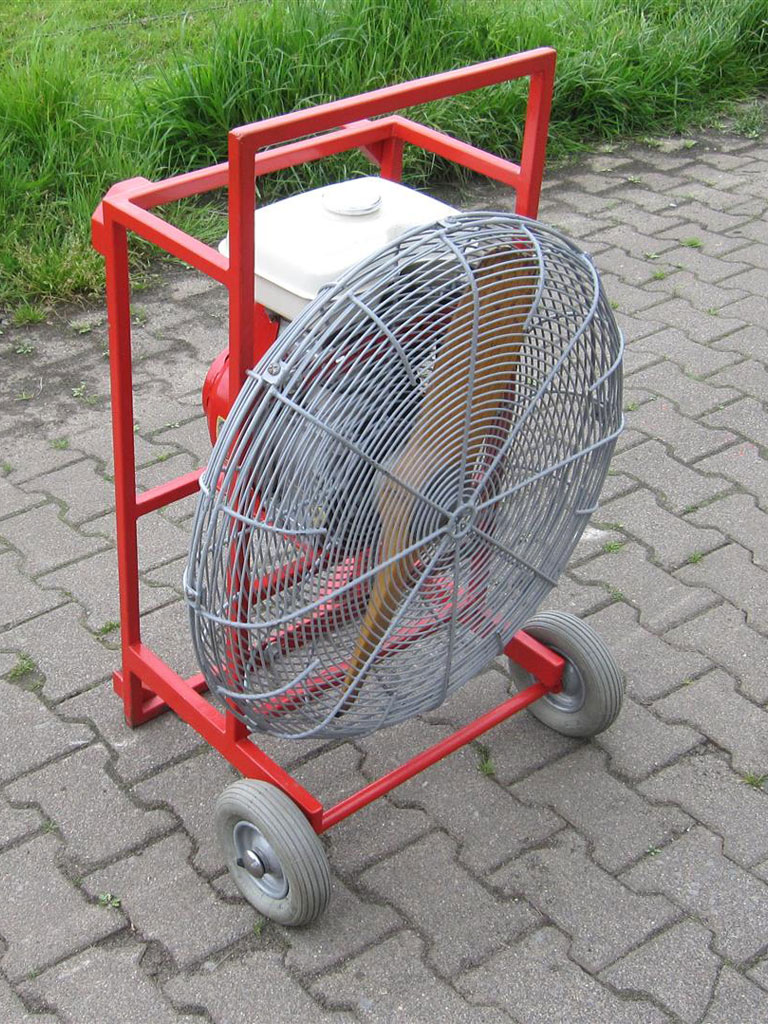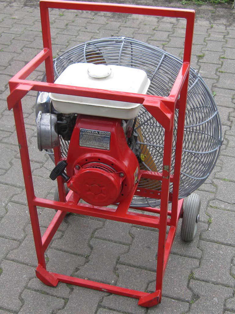 5.0 HP inflation fan, red steel square frame. GX200 Honda Engine, wooden propeller. Easy to store in basket during transportation. In excellent state of maintenance. Just had is annual maintenance.