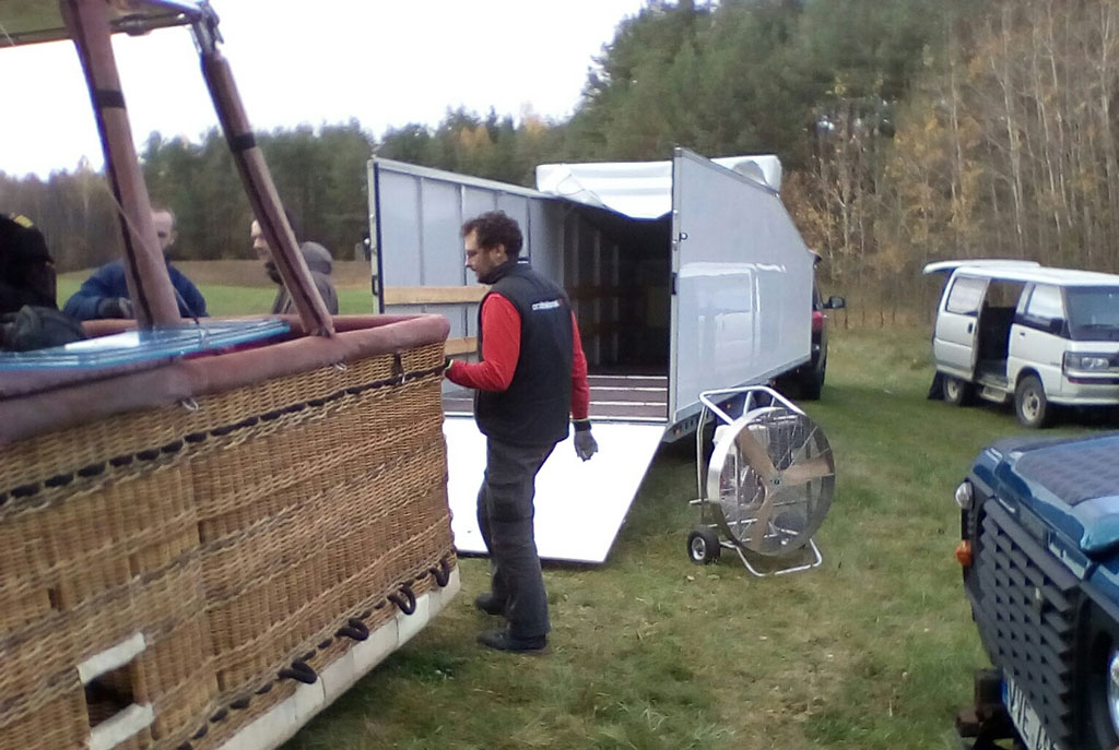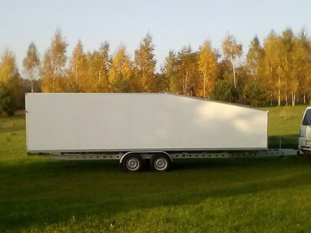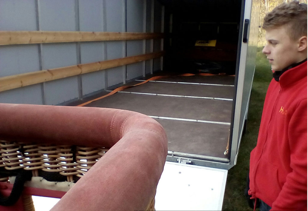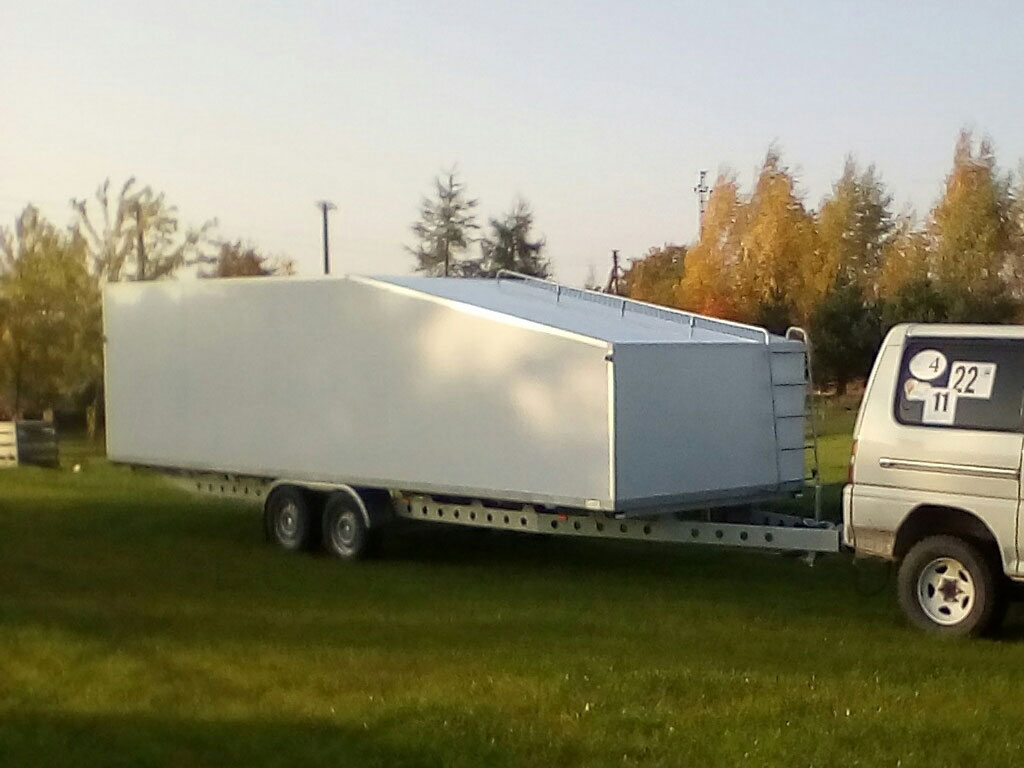 Tandem axle closed trailer with solid walls. Roof (4m) can be opened. Inside dimensions: 7.0m x 2.0m. Back height 1.7m, front height 1.25m. Emty weight 1100 kg, max total mass 2700 kg. With winch for loading the basket. Rollers integrated in floor. Custom made, easy to drive through fields and (un)load the balloon. In as new condition, only used for 1 season.