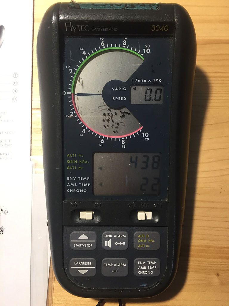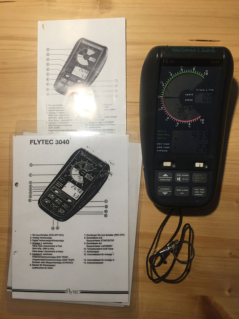 Flytec 3040 with TT34 transmitter (not photographed), in use since 2000. In lower vario screen part are some display errors, but not very critical.