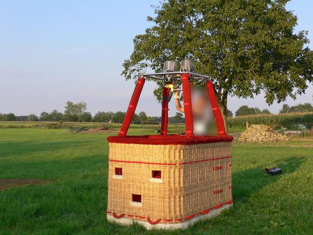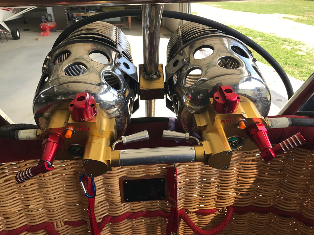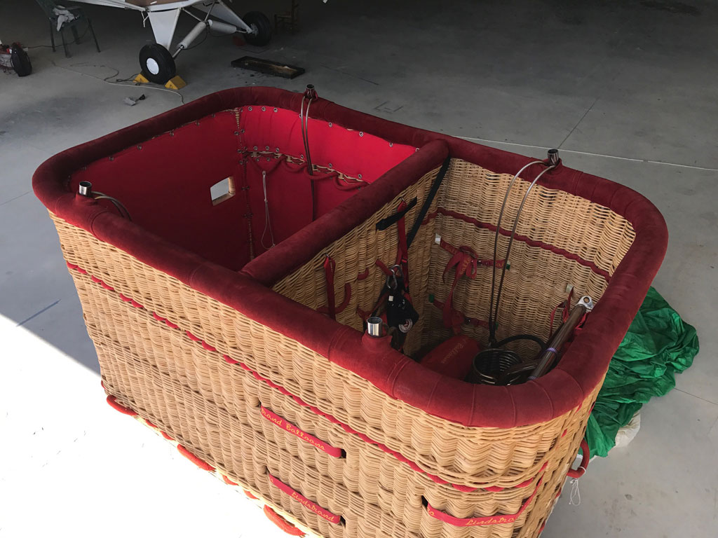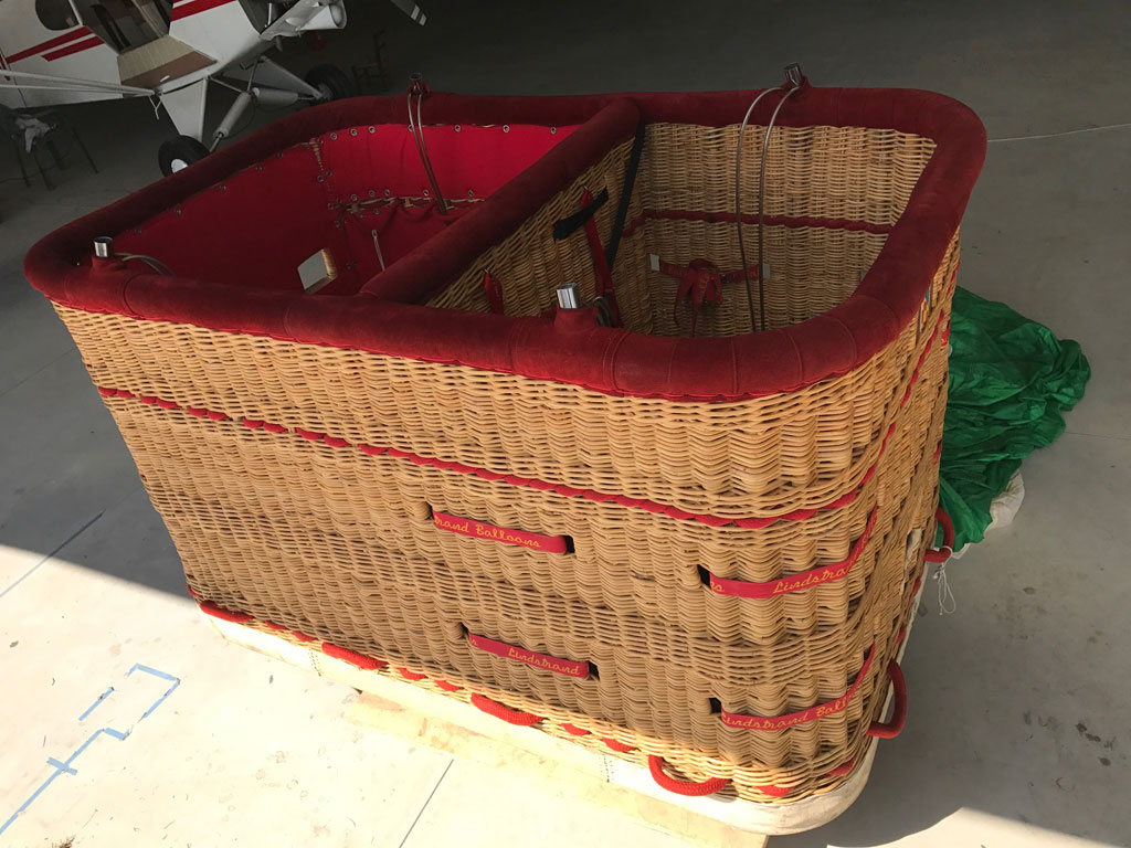 Lindstrand LBL partitioned basket, built 2005, size '17', outside dimensions 2.05 x 1.25m, red suede top rim, cushion floor, side wall padding, fire extinguisher, drop line, pilot restraint harness. Lindstrand Jetstream Series 2 double burner, built 2005, liquid pilot lights, REGO fittings. In as new condition.