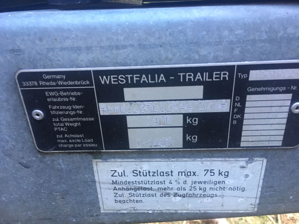 3.0m single axle Westfalia trailer with heavy gas struts. In really good condition. New tyres. Max weight 1400 kg but can be changed to 750 kg. Normally stored in garage.