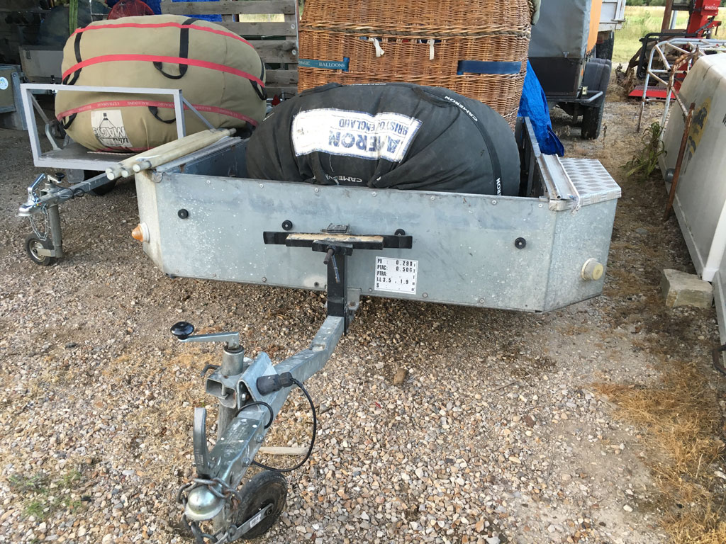 F-GKBI, Cameron O-65, built 1991, 140 hrs. Cameron Aristocrat basket, 1.29m x 1.12m, black suede top rim, fire extinguisher, drop line. Cameron MK4 double burner, vapour pilot lights, REGO fittings. Hoses valid until 2024. 3x Worthington cylinder, (2x Master, 1x slave), blue cover, REGO. PRV/PPT/INT until 2019 (2x Master) and 2024 (1x Slave). Single axle trailer, 3.5m x 1.19m, max load 500 kg. ARC valid until 24/04/2018, will be sold with fresh ARC.