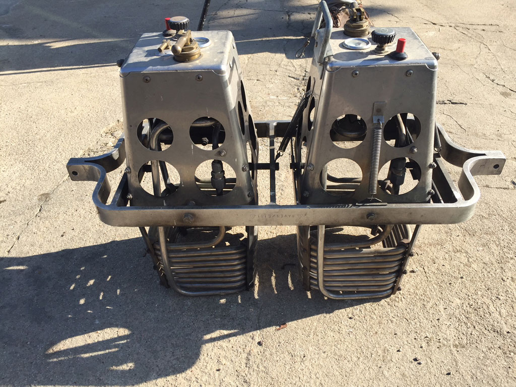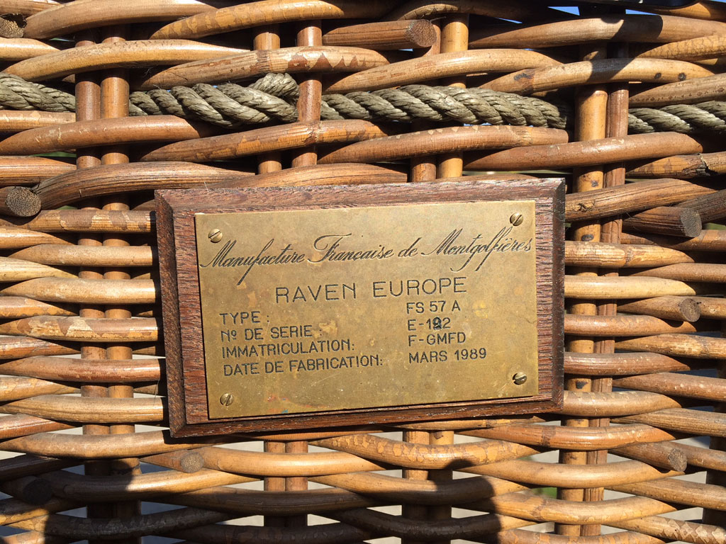 F-GMFD Raven Europe FS 57 A, built 1989, 294 flights, 294:40 hrs. 90.000 ft3. Raven Europe basket, built 1989, 294 flights, 294:40 hrs. Brown suede top rim. Drop line. Raven Europe E 101 double burner, built 1989, 294 flights, 294:40 hrs. Hoses replaced in 2010. 1x Aerostar cylinder made by Schroeder, built 2013, black cover, PRV/PPT/INT valid until 2023. 3x Worthington cylinders, PRV/PPT/INT unknown. 5.0 HP inflation fan with fixed axle and wooden propeller. Ball alti-/variometer. Can be delivered with new ARC.