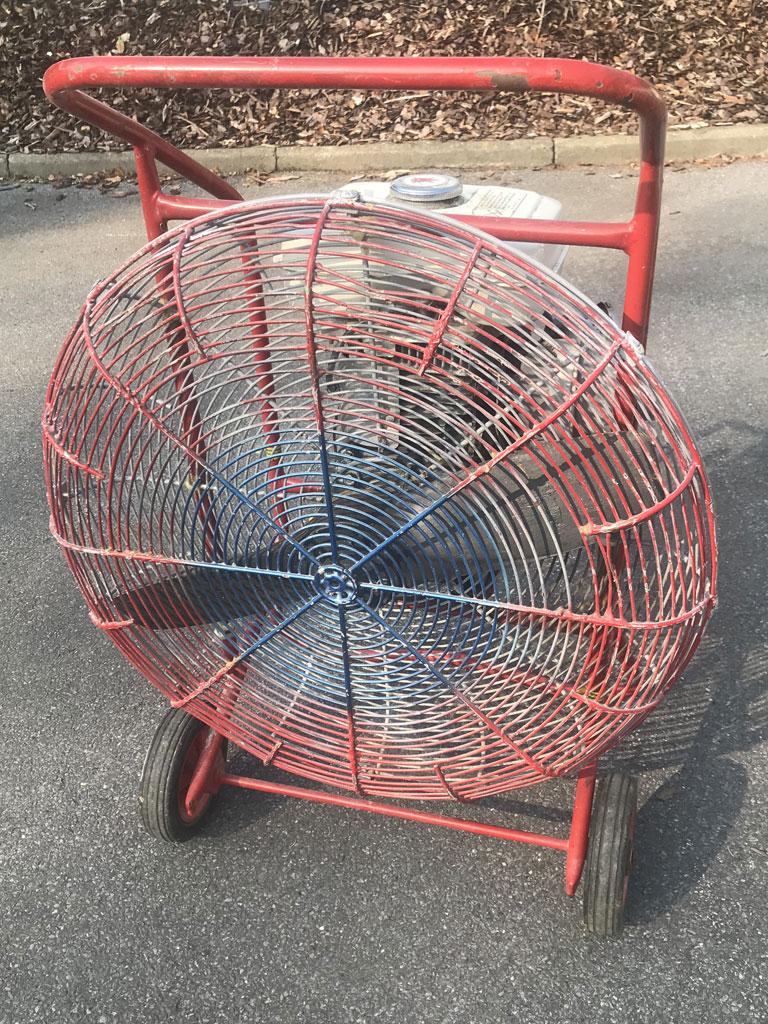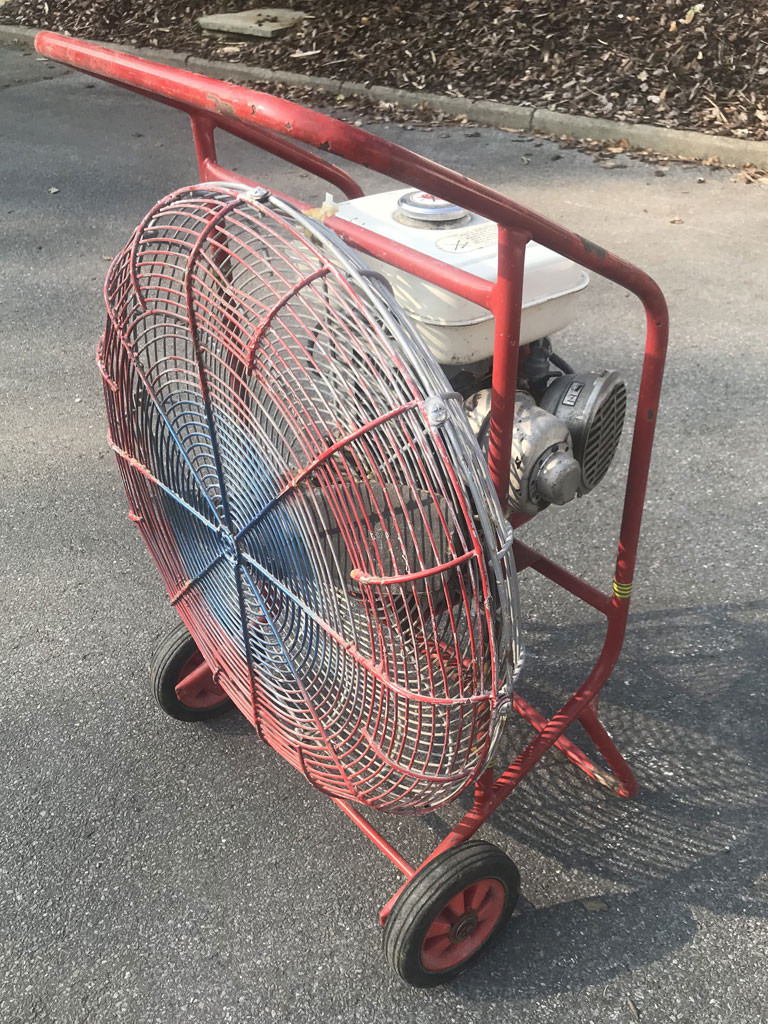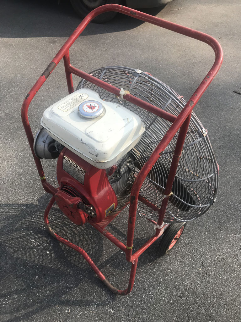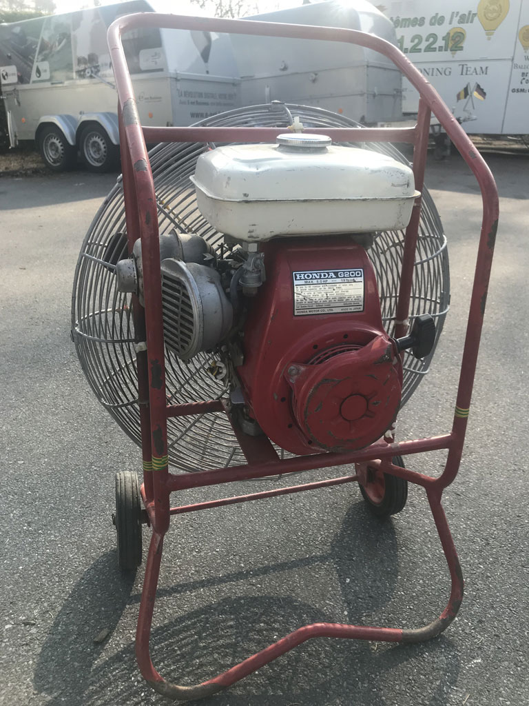 5.0 HP inflation fan, Honda engine, fixed axle frame, wooden propeller. Works very well.