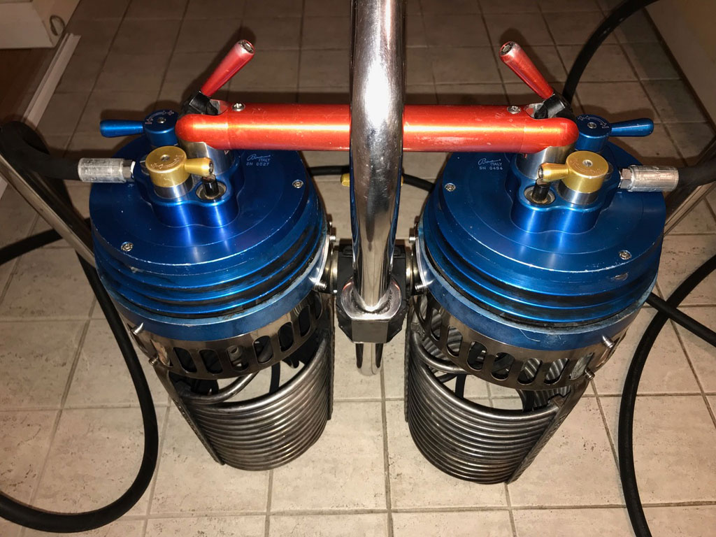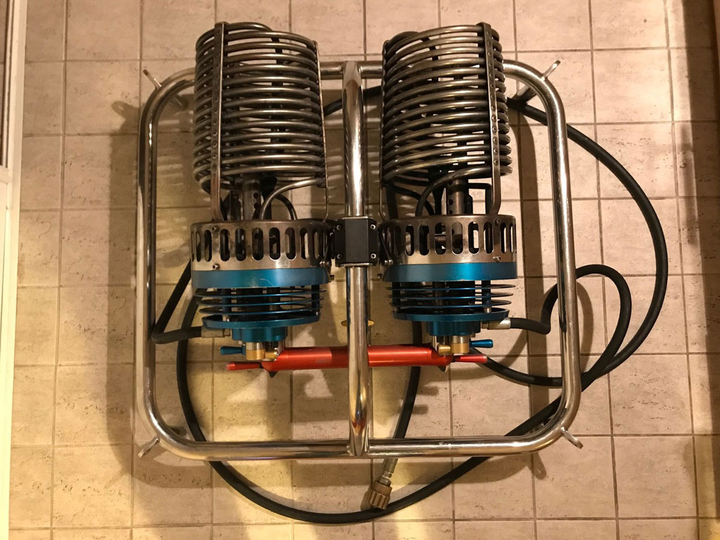 Cameron Sirocco double burner, built 05/2003. Liquid pilot lights, REGO fittings. Hoses installed 2013. Squeeze bar. Comes with EASA Form 1. Immediately available.