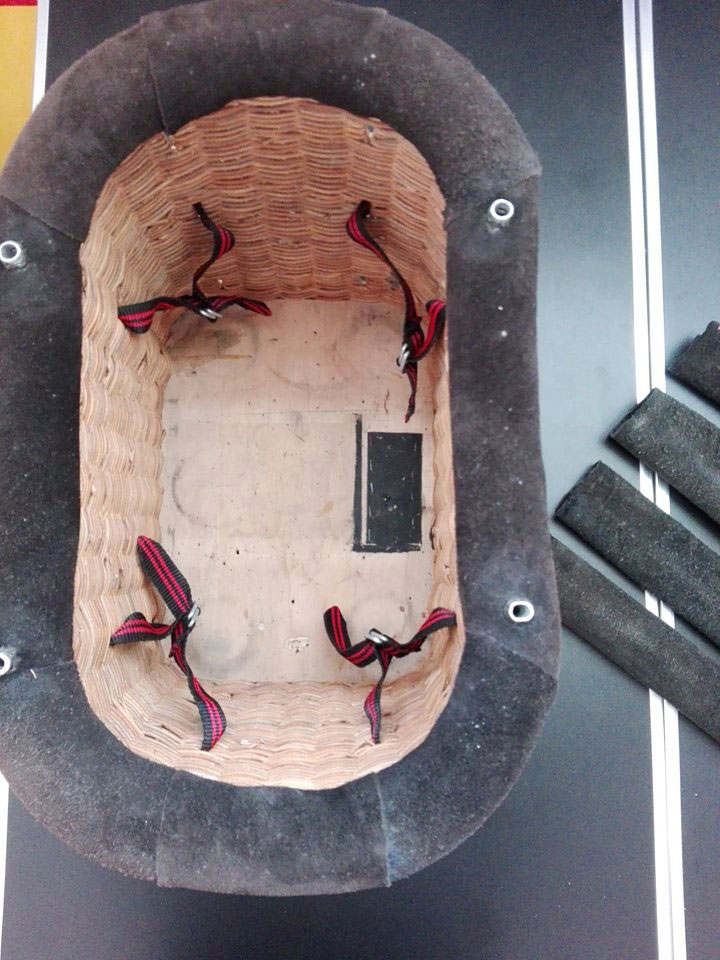 Model balloon basket Raven, suitable for model balloon envelopes size 40 m3 - 60 m3. Black suede. Fits 4x 1 liter Boelling cylinder and control box (not included). 44 x 30.5cm, 33.5cm high