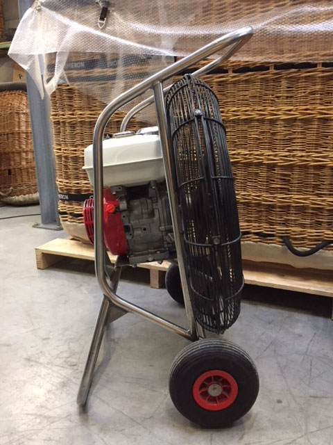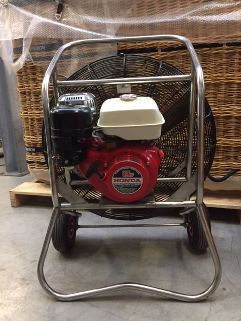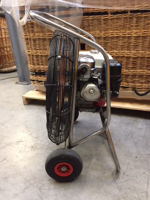 8.0 HP inflation fan, stainless steel frame with fixed axle, wooden propeller. Perfect cage, frame and propeller. One owner/balloon since new, used for 388 inflations. In great condition. Immediately available.