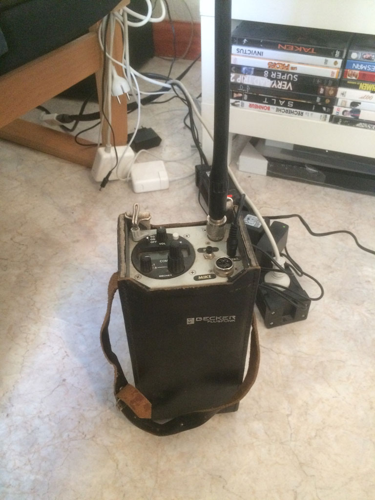Becker air band radio in PC case, 25 kHz channel spacing. Including microphone and antenna. In good working condition, needs new battery.