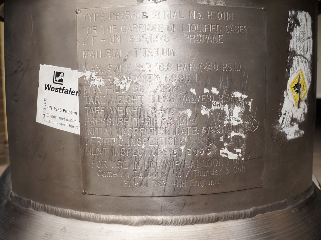 Cameron CB2380 Titanium cylinder, built 1999, usable volume 56 liter. REGO fitting, wheel valve, blue cover. PRV/PPT/INT valid until 07/2027.
