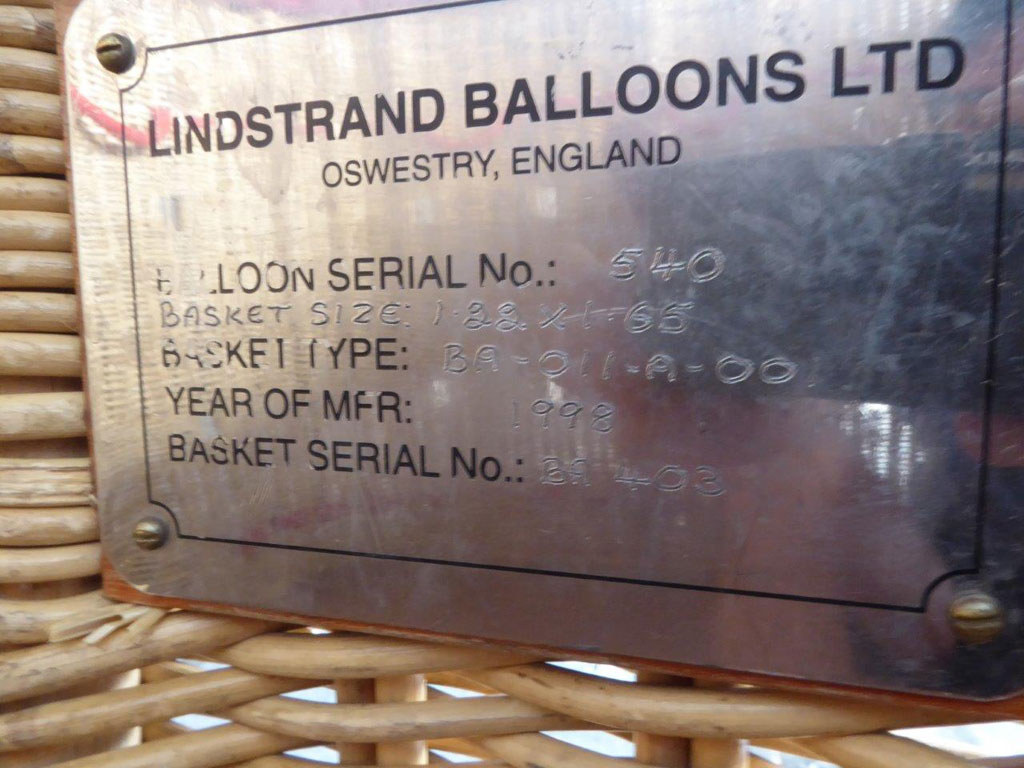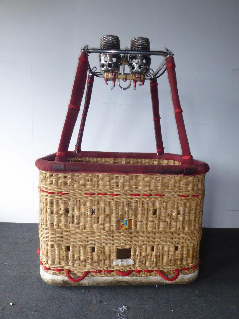 Lindstrand open basket, built 1998, inside dimensions 1.65m x 1.22m x 1.20m. Red suede top rim, cushion floor, sidewall padding, fire extinguisher, drop line. Lindstrand Jetstream 2 double burner, built 1998, liquid pilot light, REGO fittings. Burner recently serviced. Will be delivered with EASA Form 1.