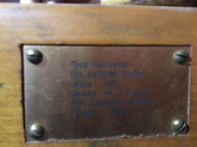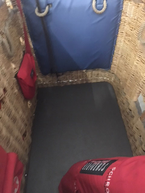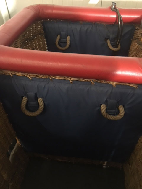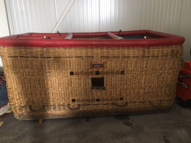 Schroeder VIII basket. Built 1996. Red leather top rim (replaced by Schroeder a few years ago), sidewall padding, cushion floor, drop line, various bags. 4 partitions: Pilot compartment in the center, 1 open side for 4 passengers, 2 small partitions for 2 persons on the other side, suitable for 8 passengers. In good condition.