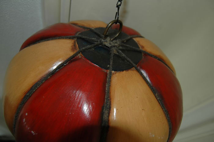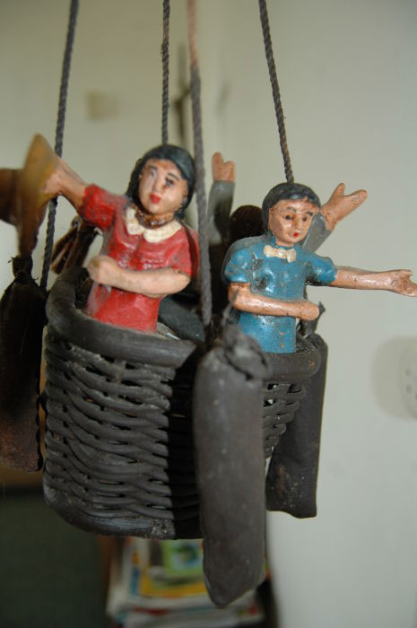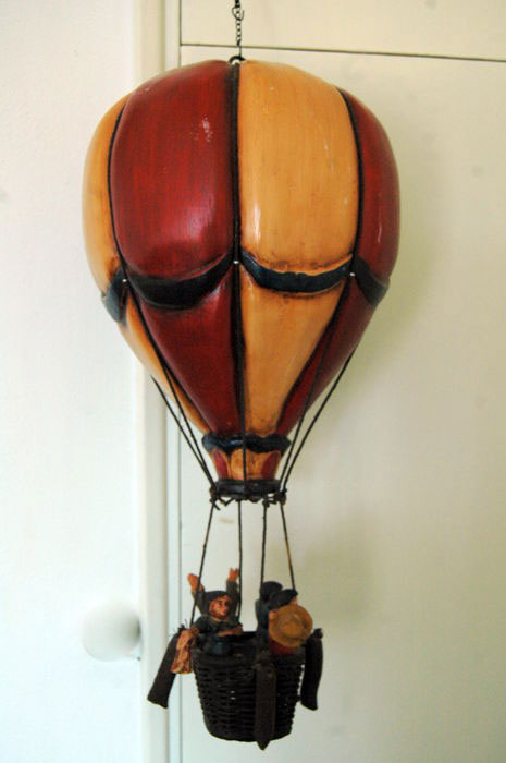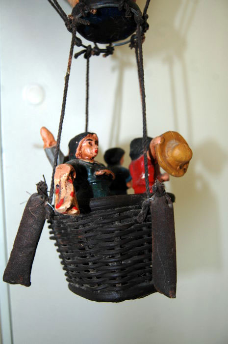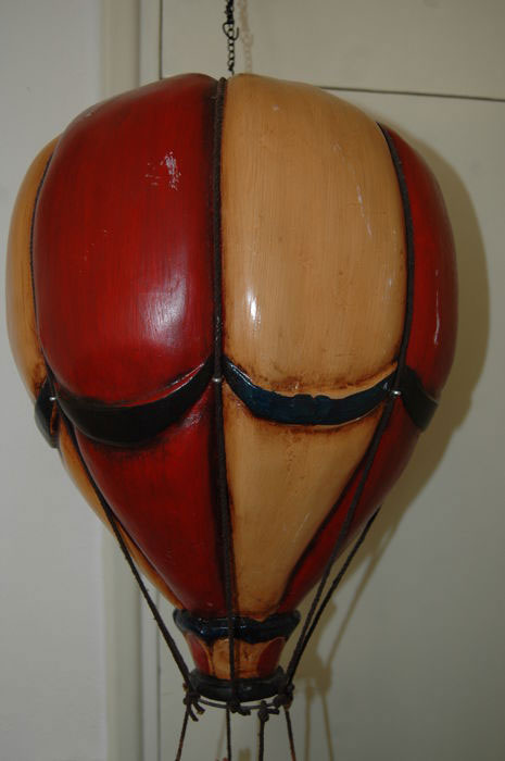 Decorational gas balloon with basket, 4 passengers and sandbags. Hook and chain on top. Overall height 75cm. Balloon diameter 45cm.