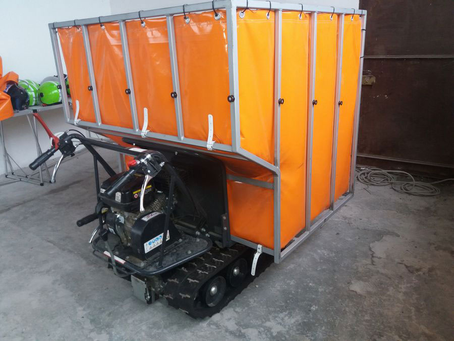 Caterpillar-track envelope transporter, with container which easily fits envelopes up to 210.000 ft3. 4 forward and 1 backward gears. In perfect working condition (less than 15 hrs of use since new).