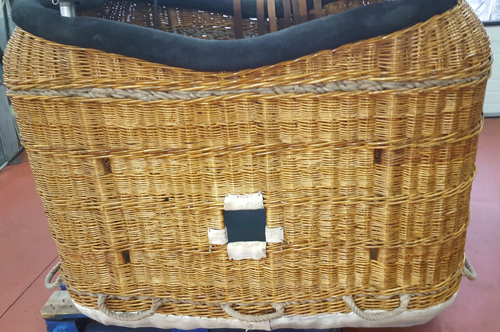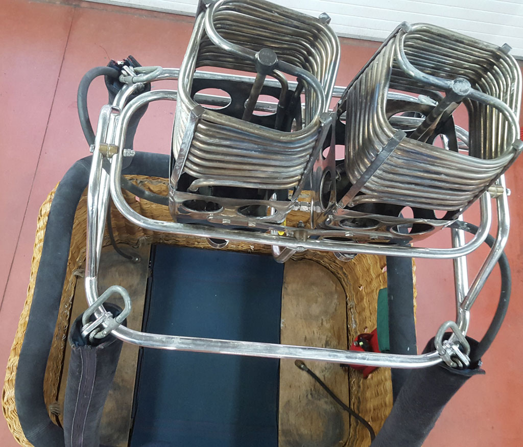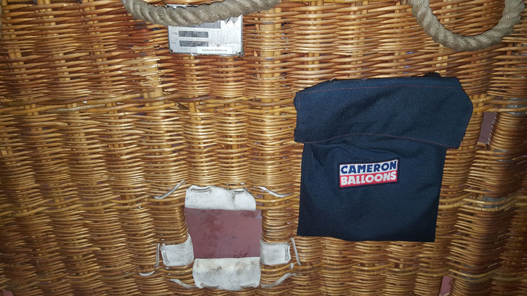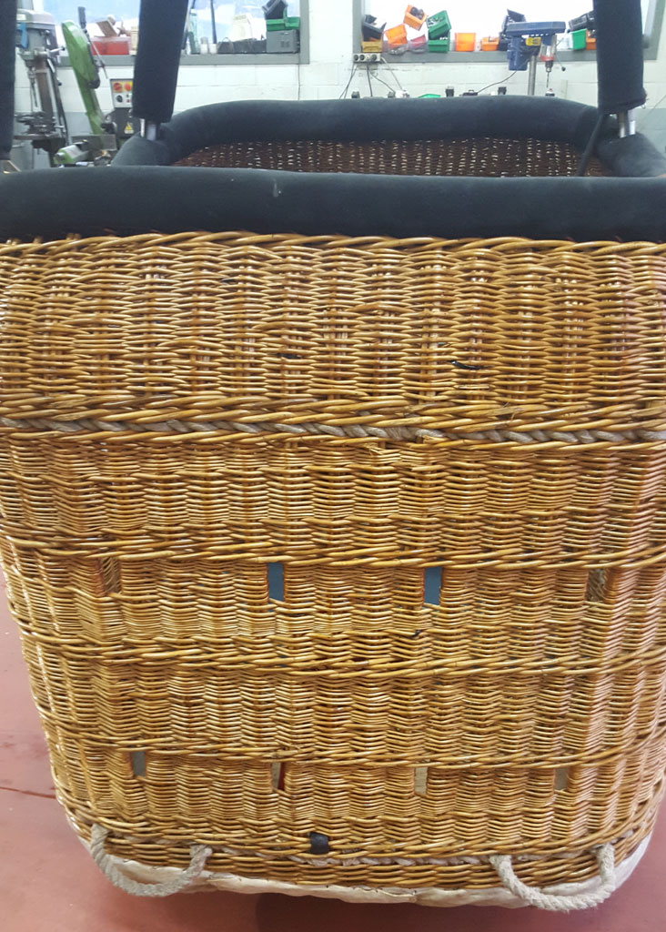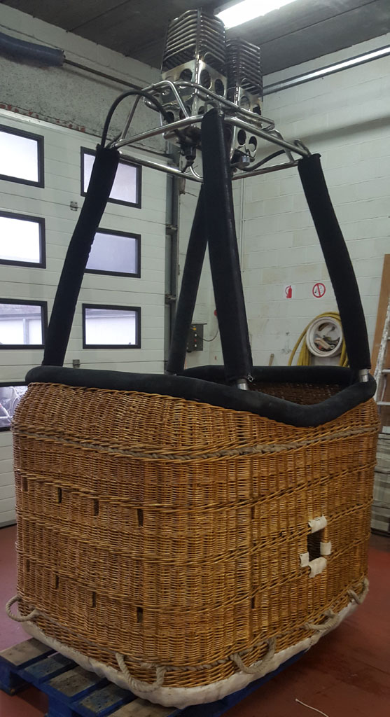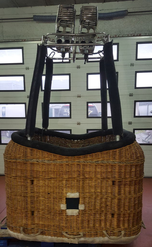 Cameron 90-105 basket (CB300-4A), built 1994, approximately 700 flights/hrs. Dark blue suede top rim, cushion floor, drop line, fire extinguisher, fixing point for pilot restraint harness. Cameron MK4 Super double burner, built 1994, approximately 700 flights/hrs, liquid pilot lights, REGO fittings, hoses dated 11/2009. In very good condition regarding age and hours.