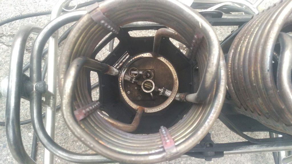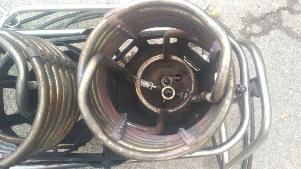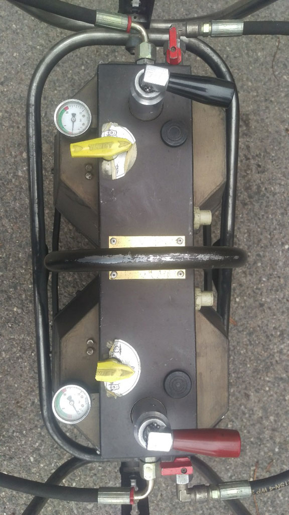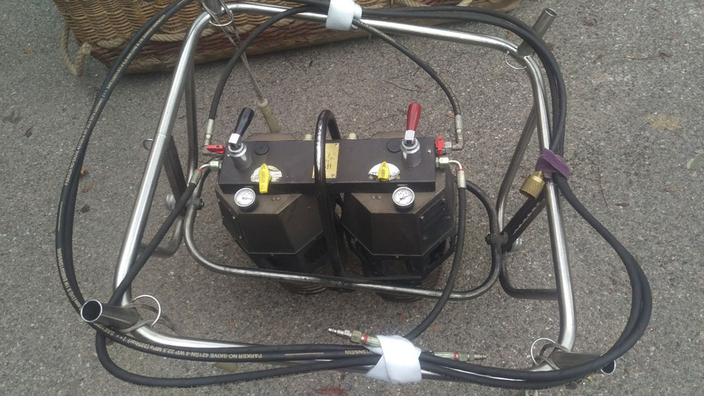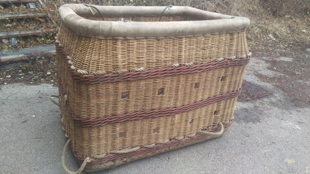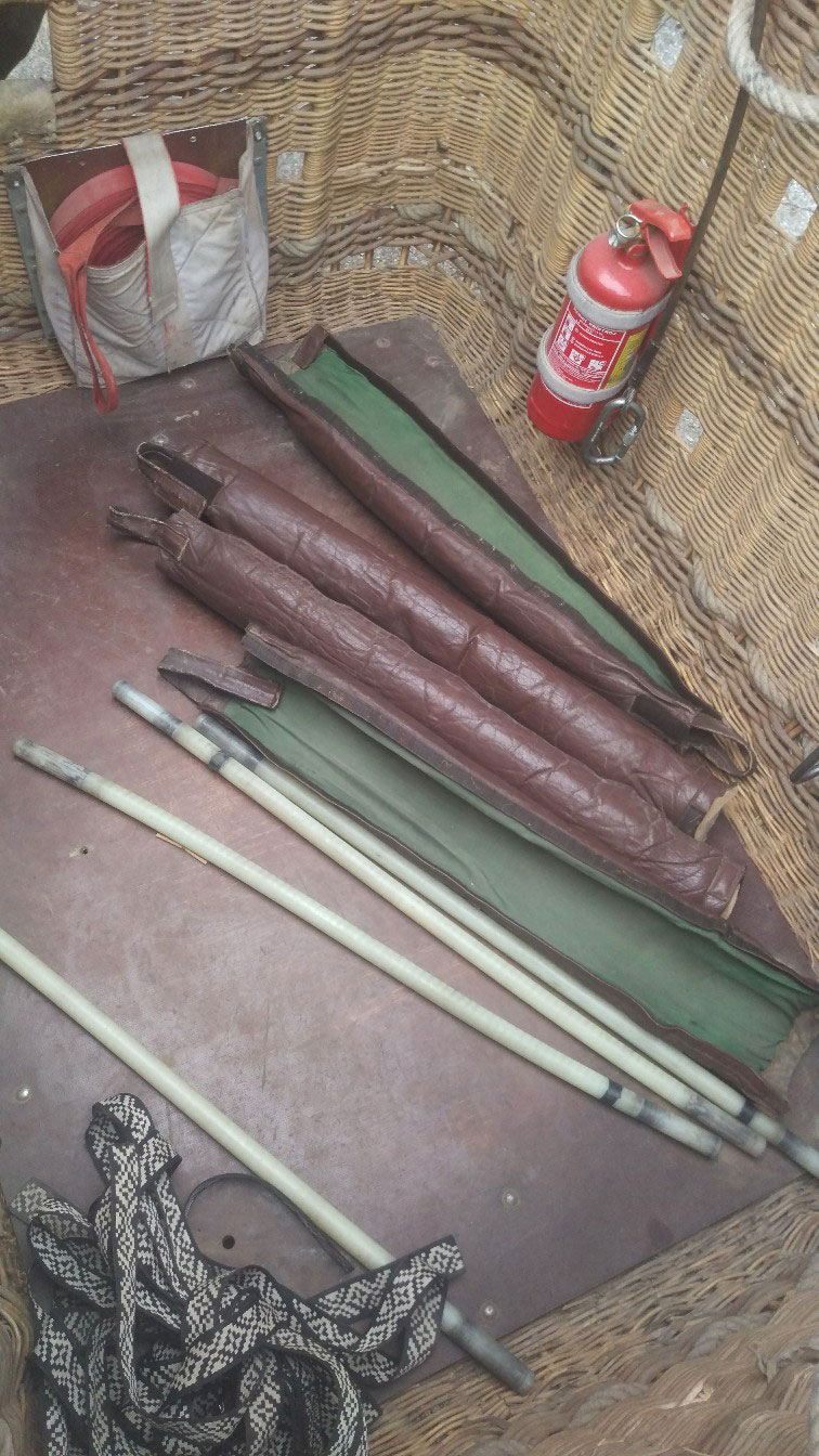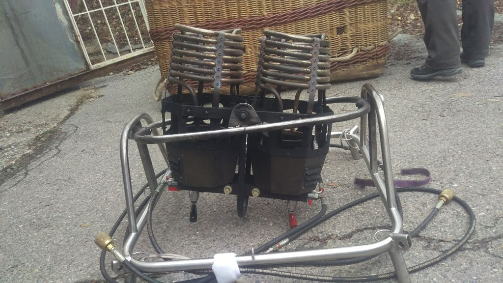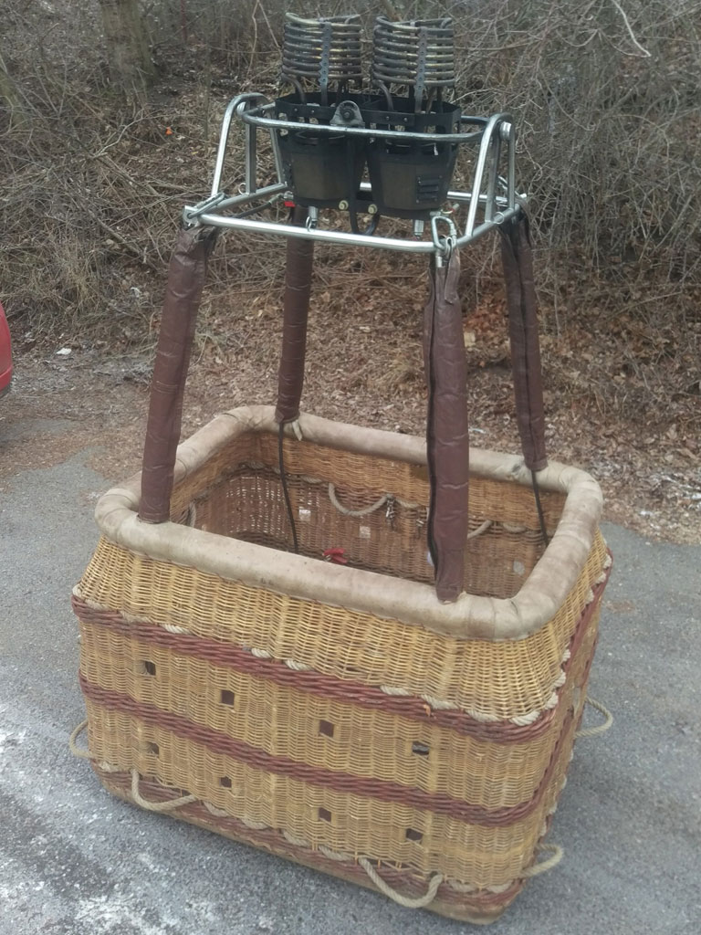 Schroeder V basket, built 1992. Light brown leather top rim, handling line, fire extinguisher, karabiners. Schroeder FB5 double burner, built 1990. REGO fittings, vapour pilot lights with Dynaquip vapour fittings. Hoses dated 04/2008. Height adjustable frame. All in good shape.