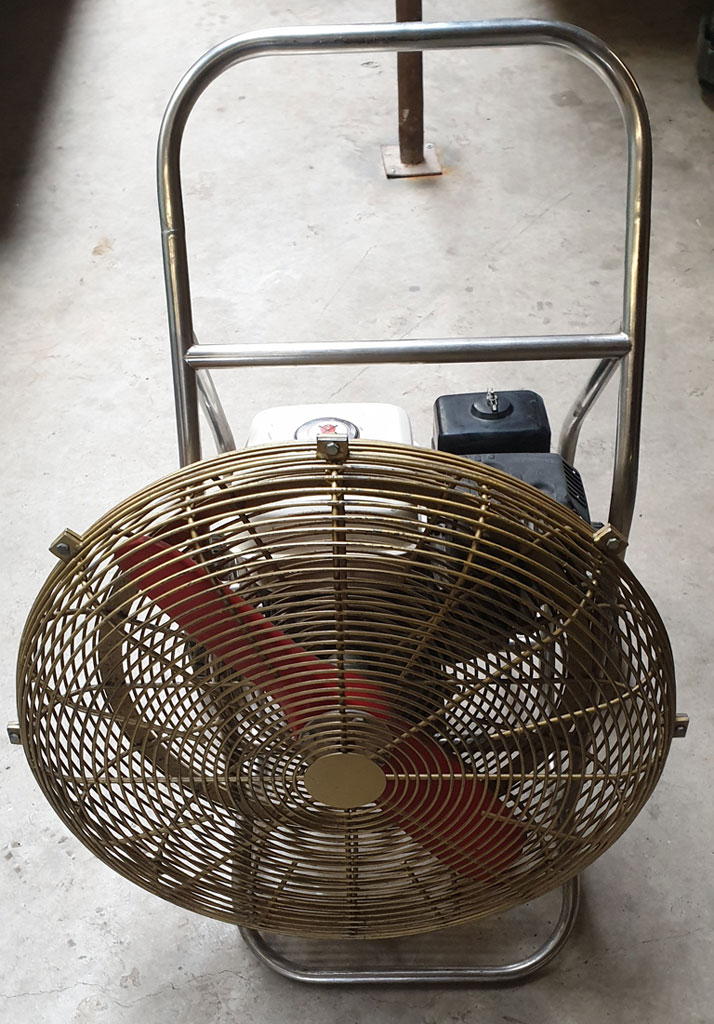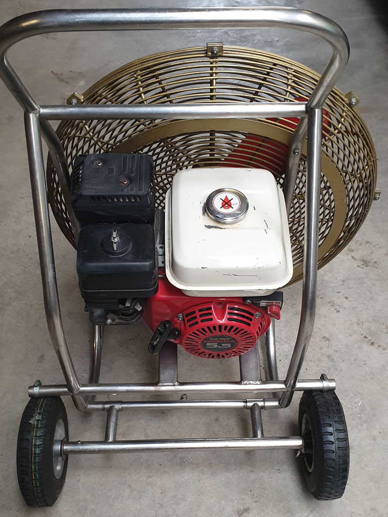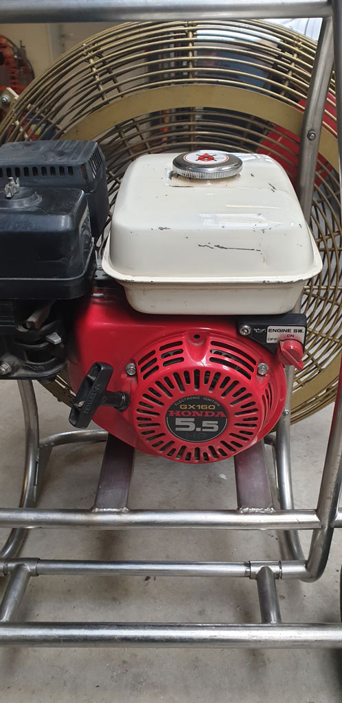 5.5 HP inflation fan, Schroeder, stainless steel flip wheel frame, in good condition.