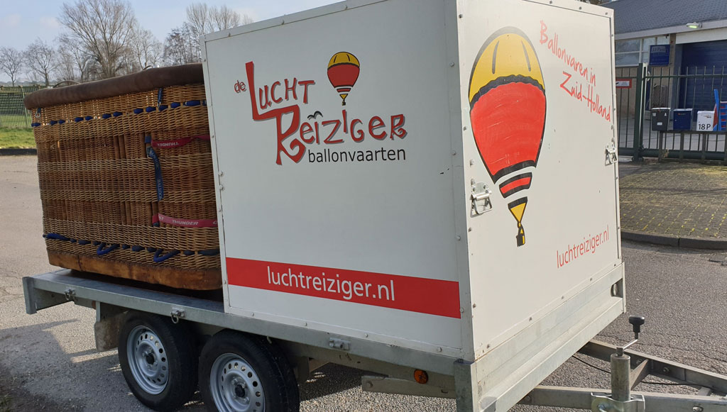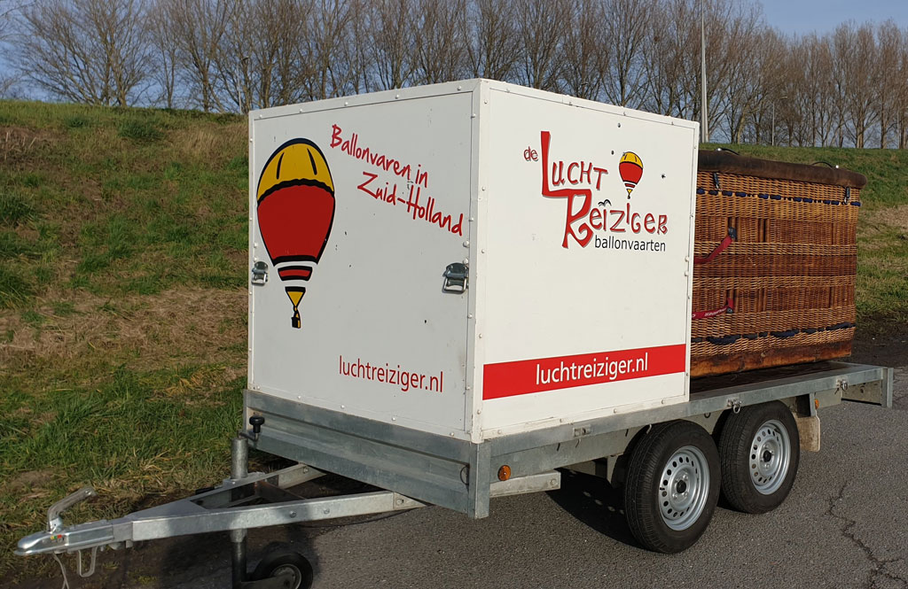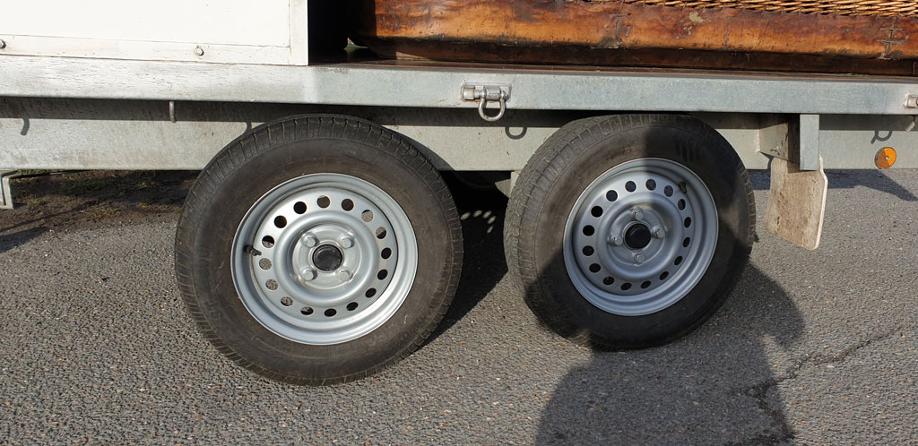 Tandem axle flat bed trailer, built 2013, dimensions 3.05m x 1.50m, box on front for envelope and inflation fan, max total weight 750 kg.