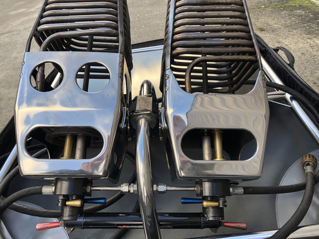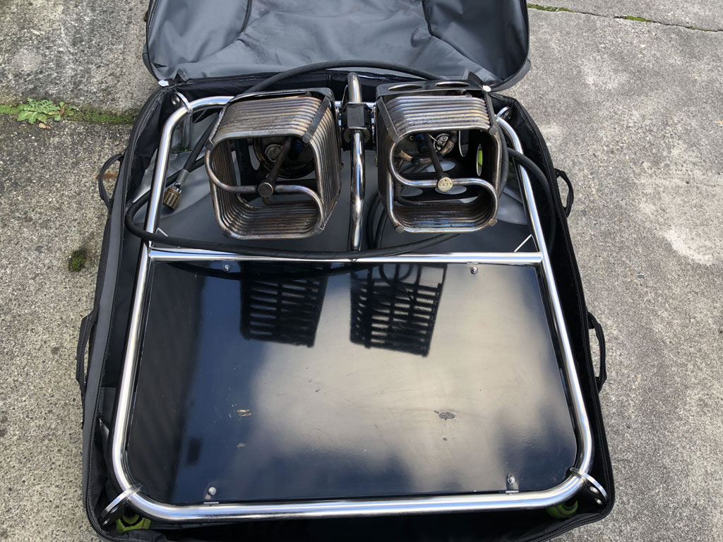 Cameron Stealth / Shadow double burner, built 1999, liquid pilot lights, REGO fittings. Hoses dated 2008. In Ultramagic frame for C6 basket, with heat shield. Custom made burner bag. Burner and frame can be sold separately.